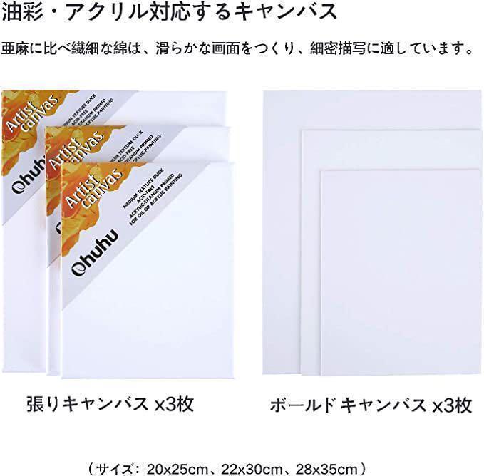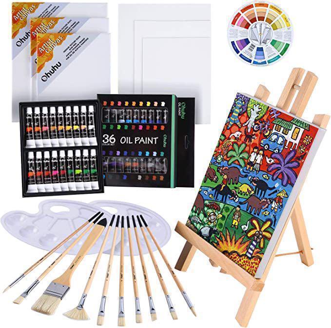 【初心者にも教材にも最適】[セット内容] 油絵具 x36色(12ml)、木製イーゼル x1個、張りキャンバス x3枚(サイズ:20x25cm、22x30cm、28x35cm)、ボールドキャンバス x3枚(サイズ:20x25cm、22x30cm、28x35cm)、油彩筆 x10本、パレット x2個、カラーホイール x1個。絵具・筆・パレットなどの基本的な画材が入ったシンプルな絵の具セットです。