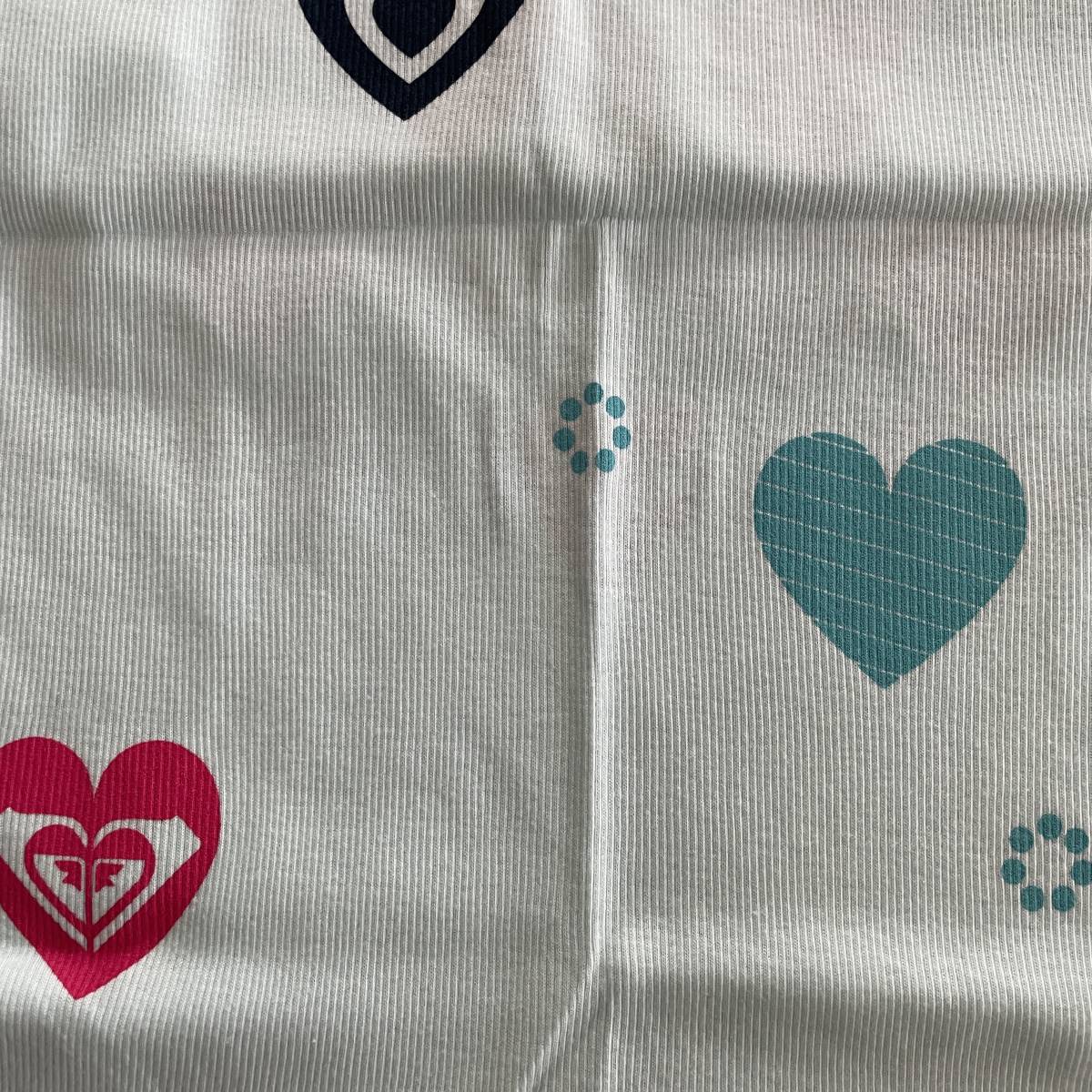 ・色は水色です。リブ編みのような生地です。前面中央にハートマーク等がたくさん描かれています。後ろにも形や色がさまざまなハートやロゴマークが描かれています。