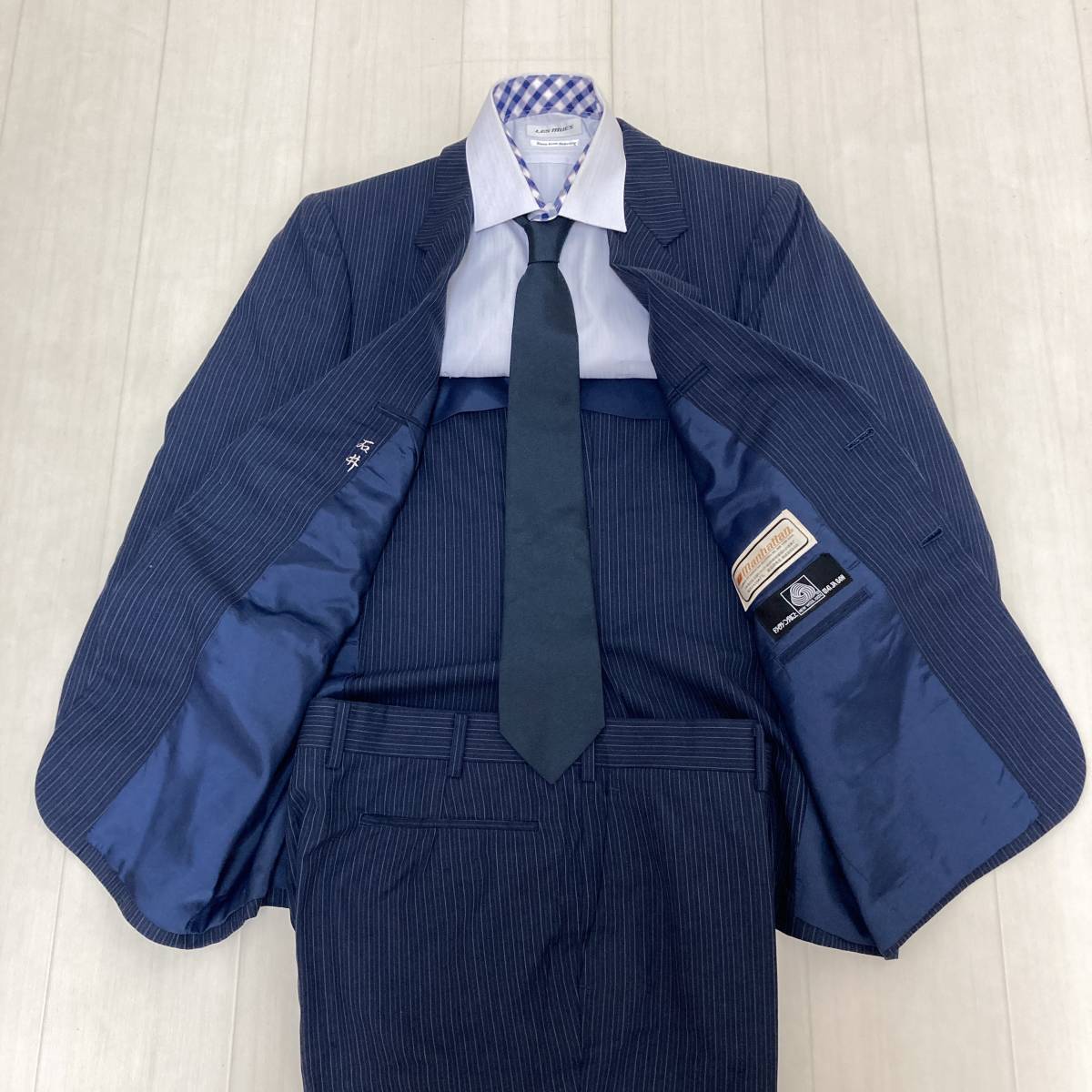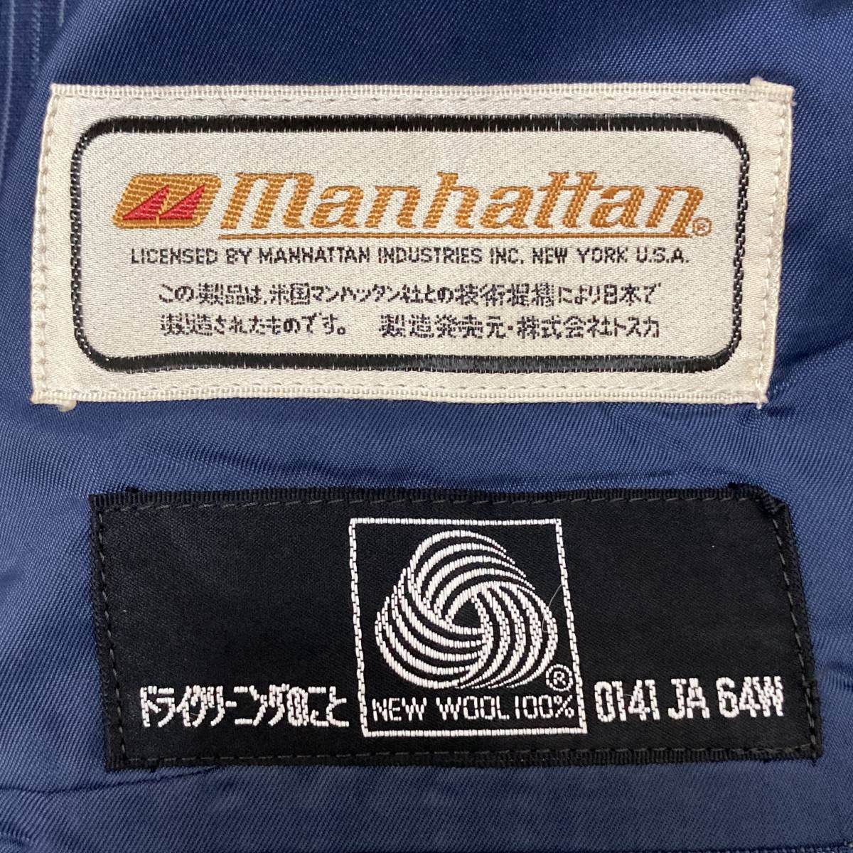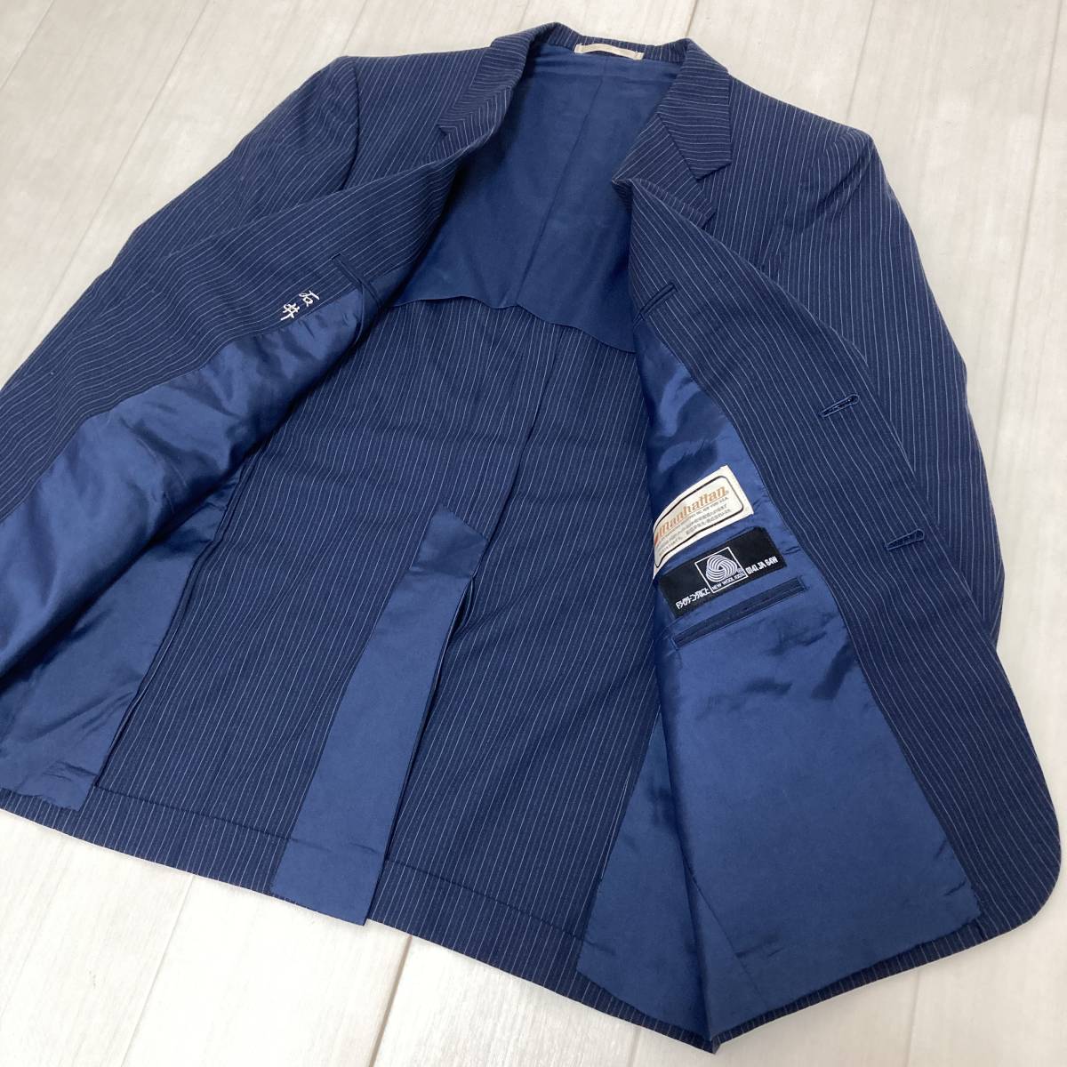 a03652 美品 manhattan スーツ セットアップ シングル 肩パット 毛100% 裏地 ストライプ 170-98-94 紺 上品 オフィススタイリッシュルック