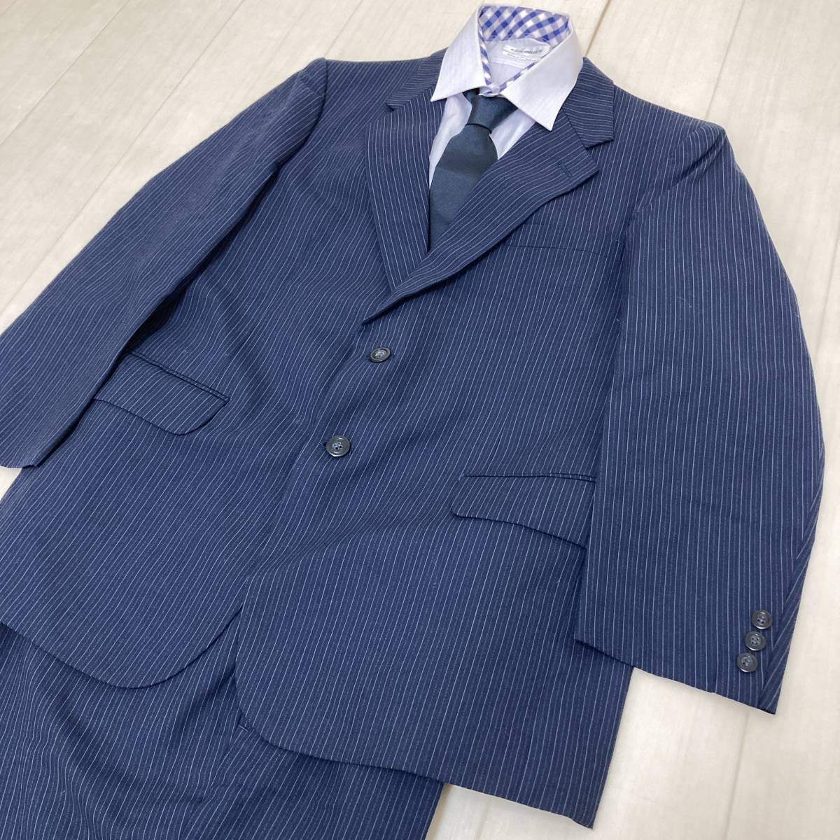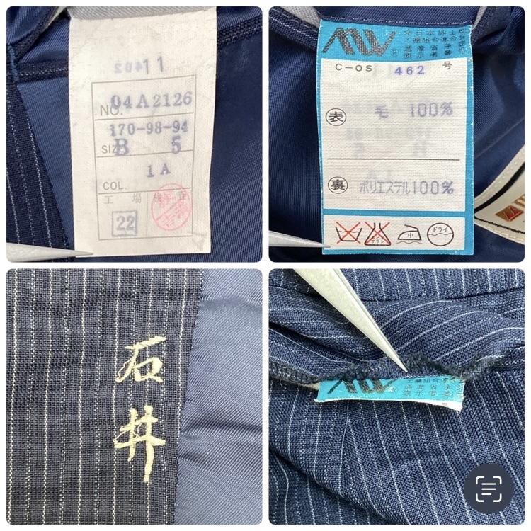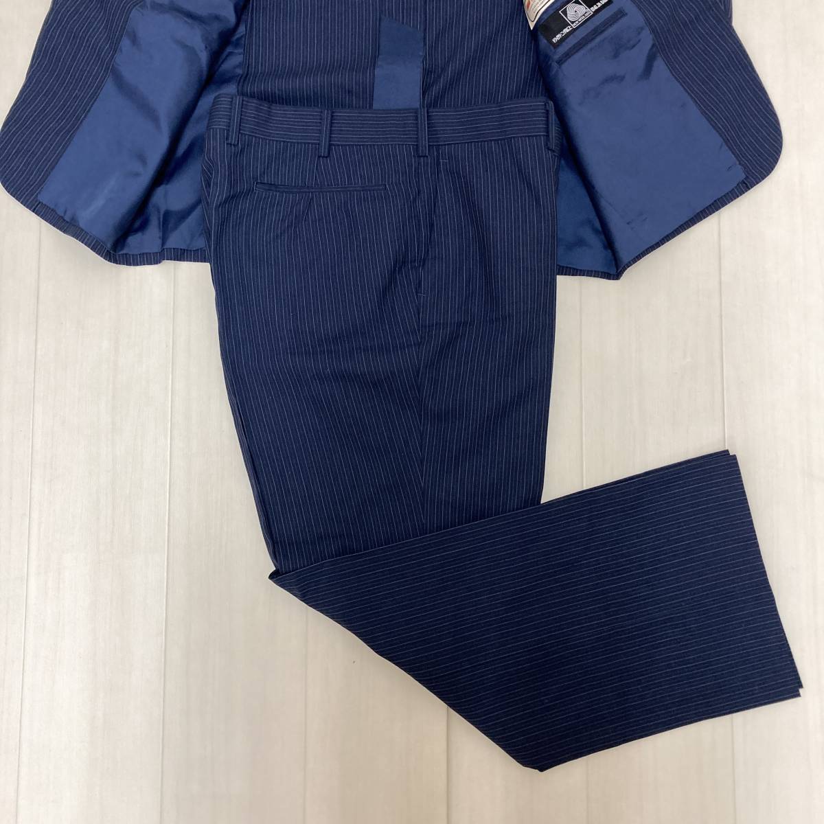 a03652 美品 manhattan スーツ セットアップ シングル 肩パット 毛100% 裏地 ストライプ 170-98-94 紺 上品 オフィススタイリッシュルック