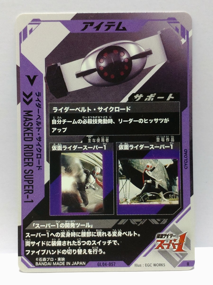 「仮面ライダーバトル ガンバレジェンズGL4弾 ライダーベルトサイクロード(R GL04-057)」を出品します。「おまとめ」可能な方は4枚までミニレター送料85円でお取扱いできます。5枚以上の場合は定形郵便で送料別途計算となります。