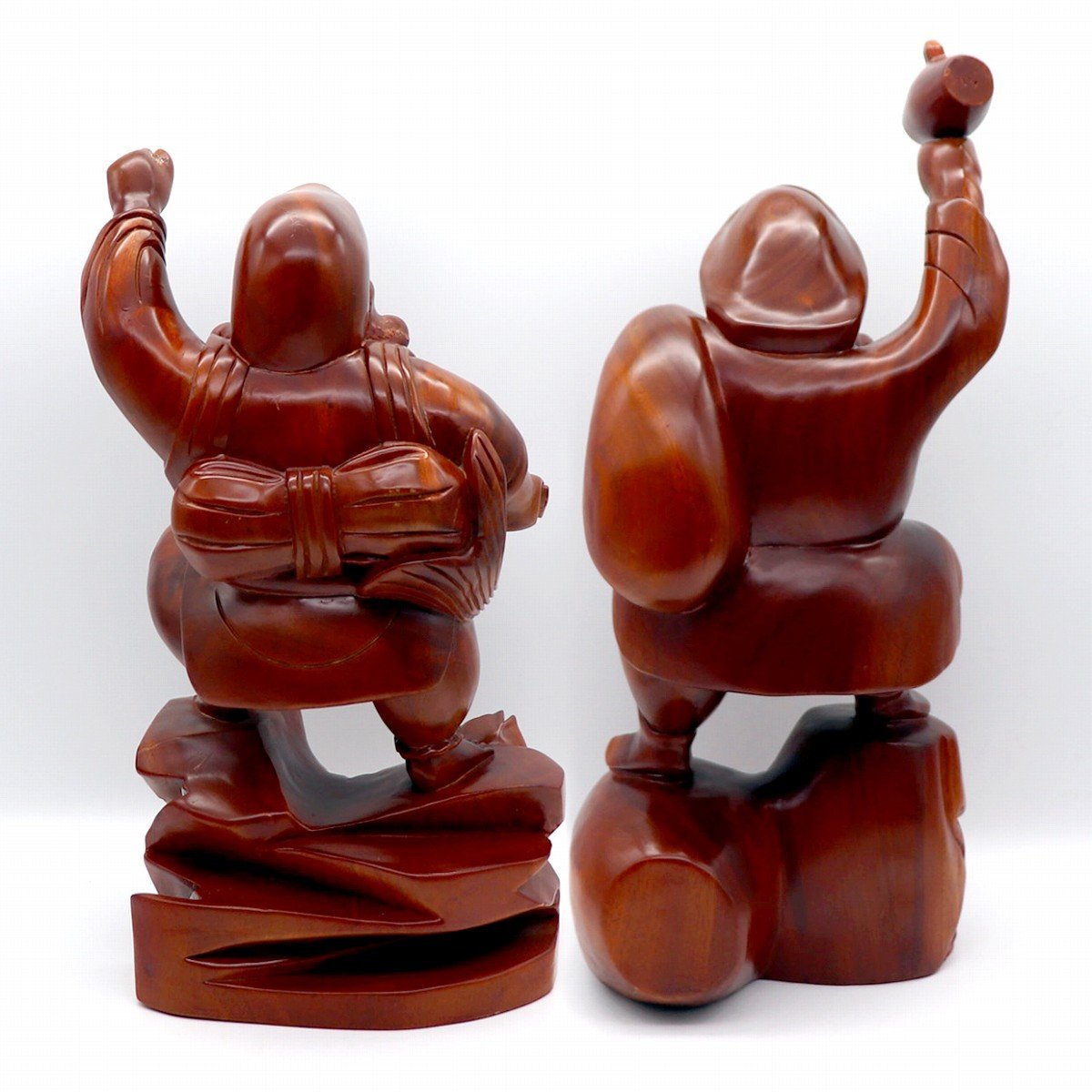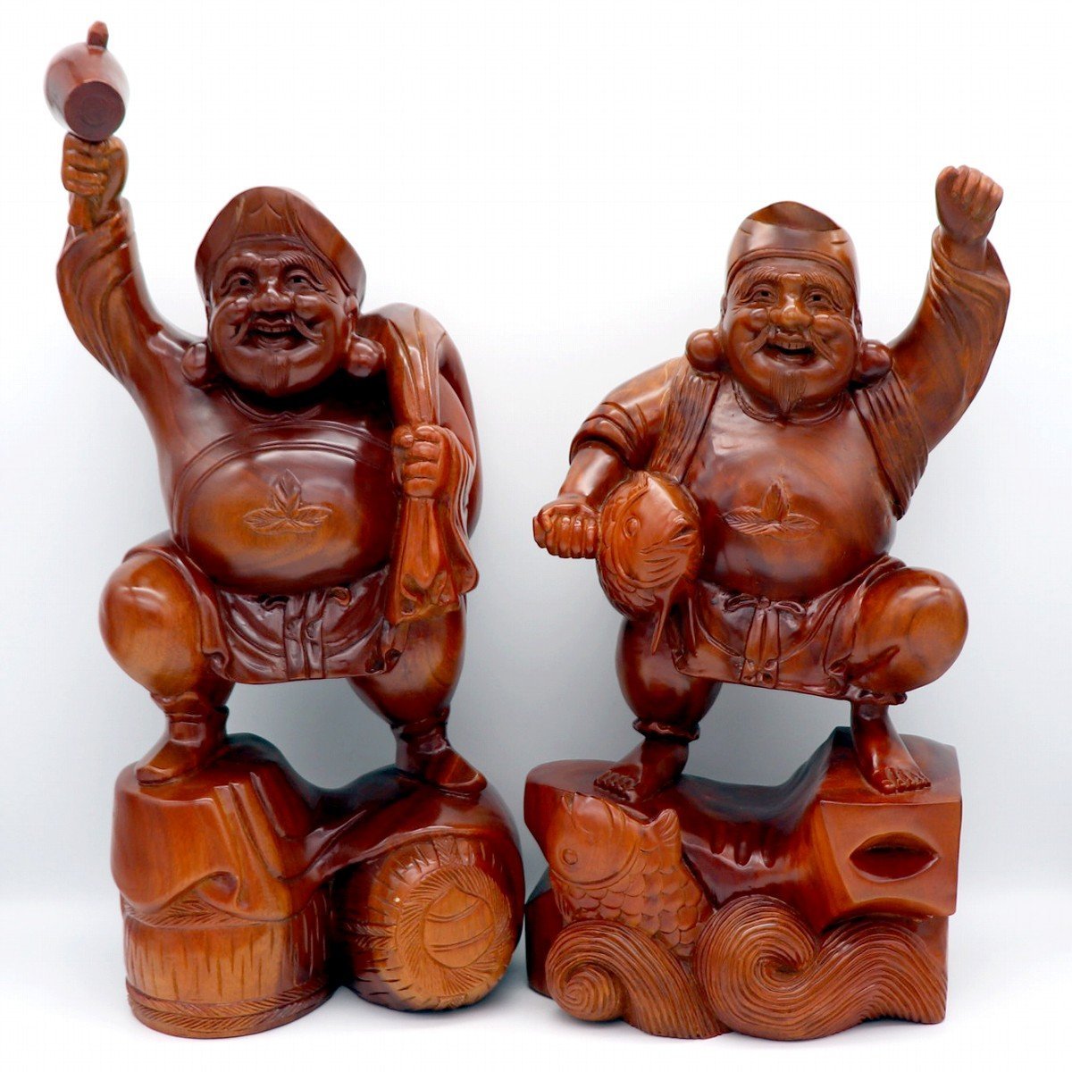 大黒(幅:約220mm、奥行:約155mm、高さ:約480mm)、恵比寿(幅:約220mm、奥行:約160mm、高さ:約415mm)、状態ランク:D、ヒビ割れあり。恵比寿の釣り竿紛失。
