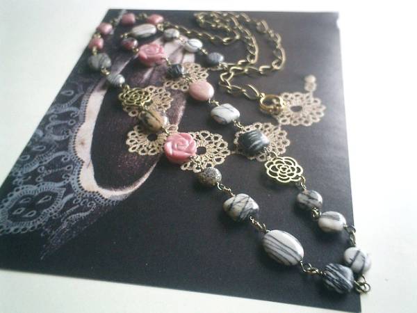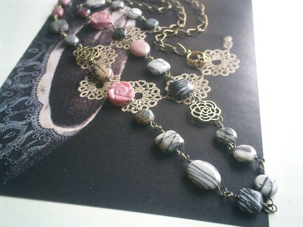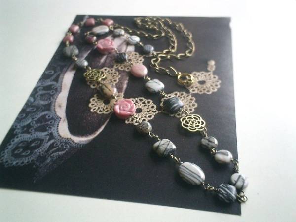 シックな薔薇・・シリーズです♪薔薇のモチーフ・・シックなロードナイトのネックレスです♪ジャスパーや薔薇のモチーフを合わせてロマンチックな表情です♪ロードナイトは9ミリのスクエア、コイン、14ミリの両面薔薇、オーバルです♪長さは全長90センチ位で調節自由です♪2連にされても素敵です♪お揃いのブレスレットも出品しています♪シンプルで飽きのこないいつまでも着けられるデザインを考えて作りました♪ハンドメイドをご理解頂いてノークレーム、ノーリターンでお願いします