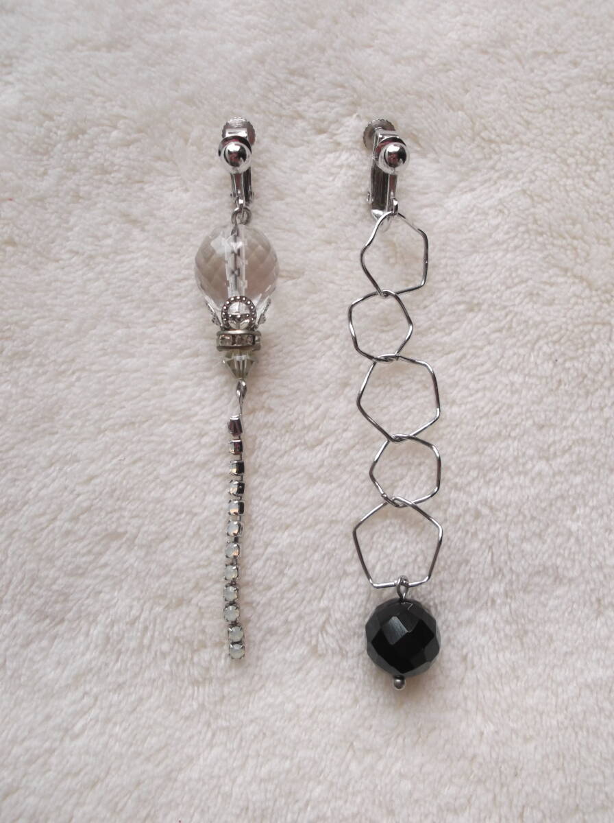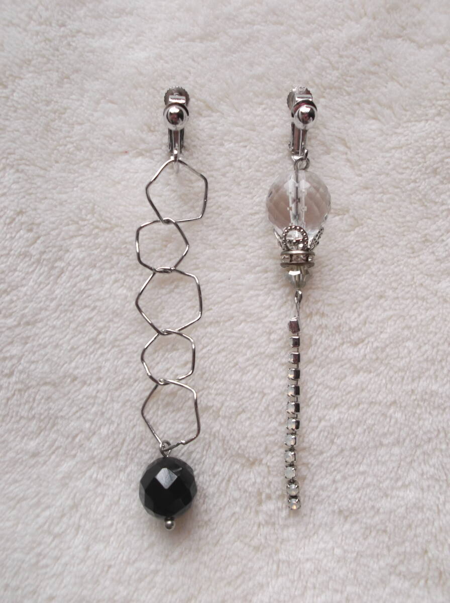 超オシャレ! アシンメトリー 左右デザイン違い イヤリング シルバー クリスタル カット 透明 クリア 黒 ブラック オパール調 ビーズ☆即決