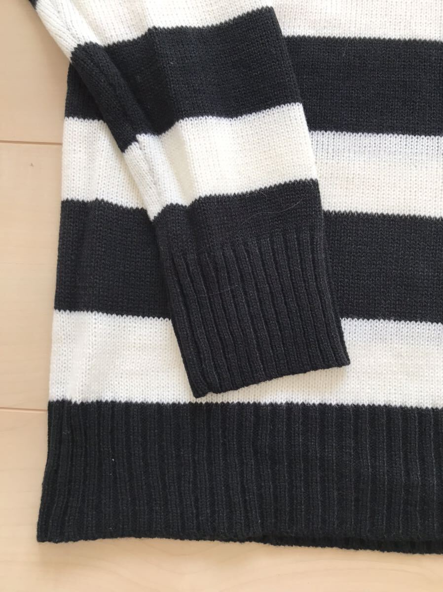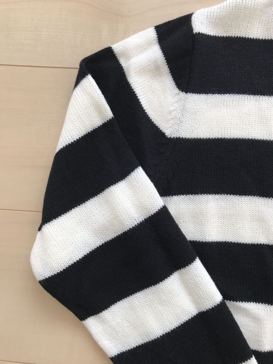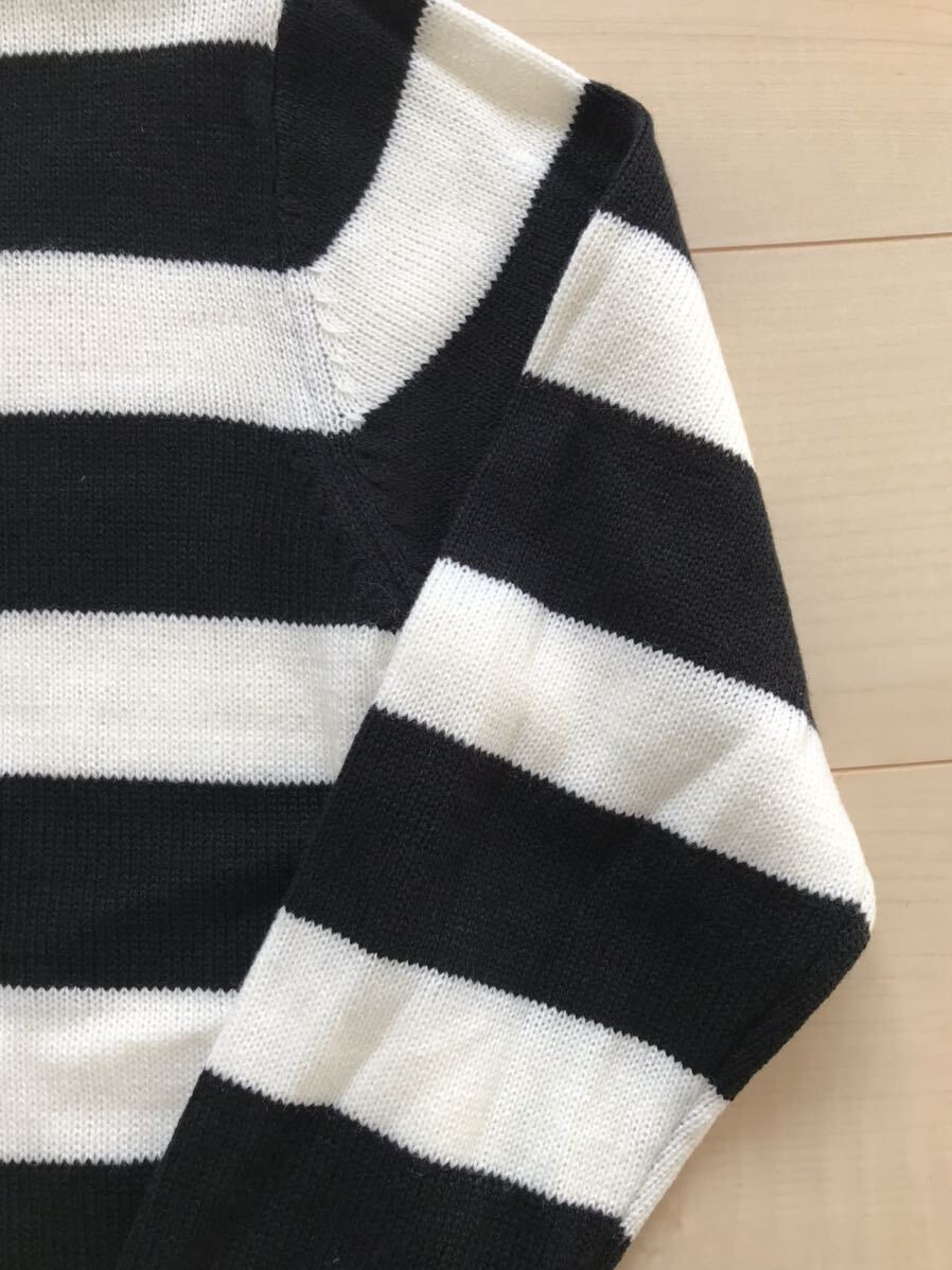備考…アクリルニットのバルキー編みボーダーでバイカラーに仕上げた長袖Vネックプルオーバー。