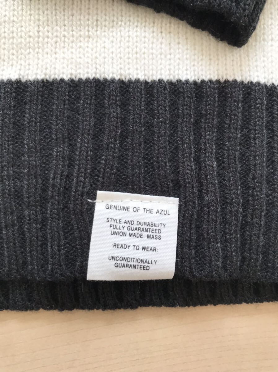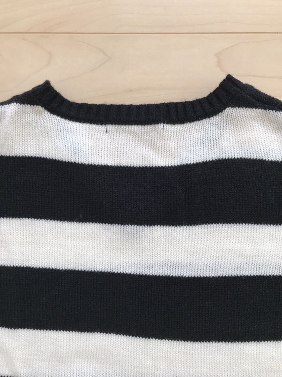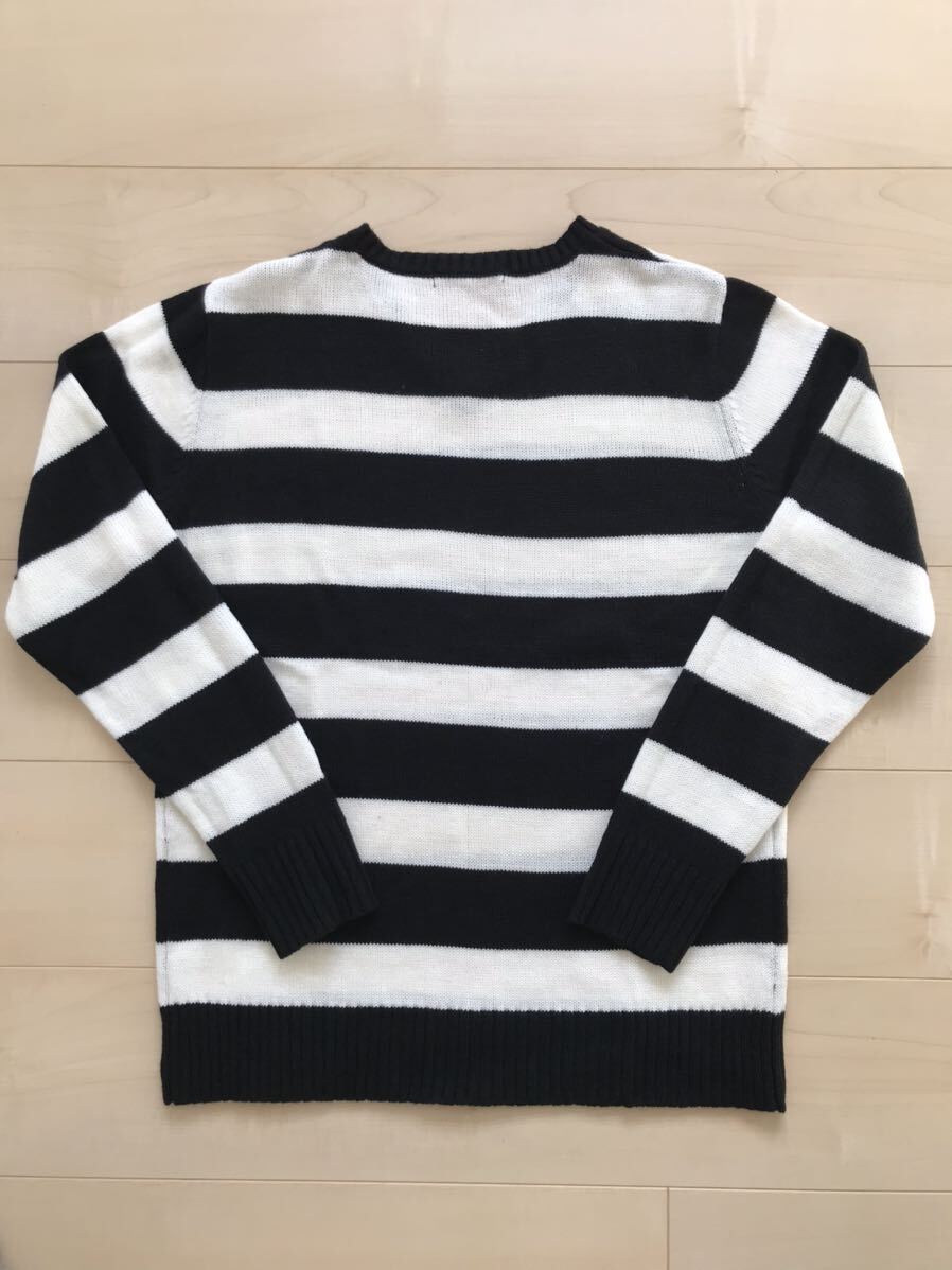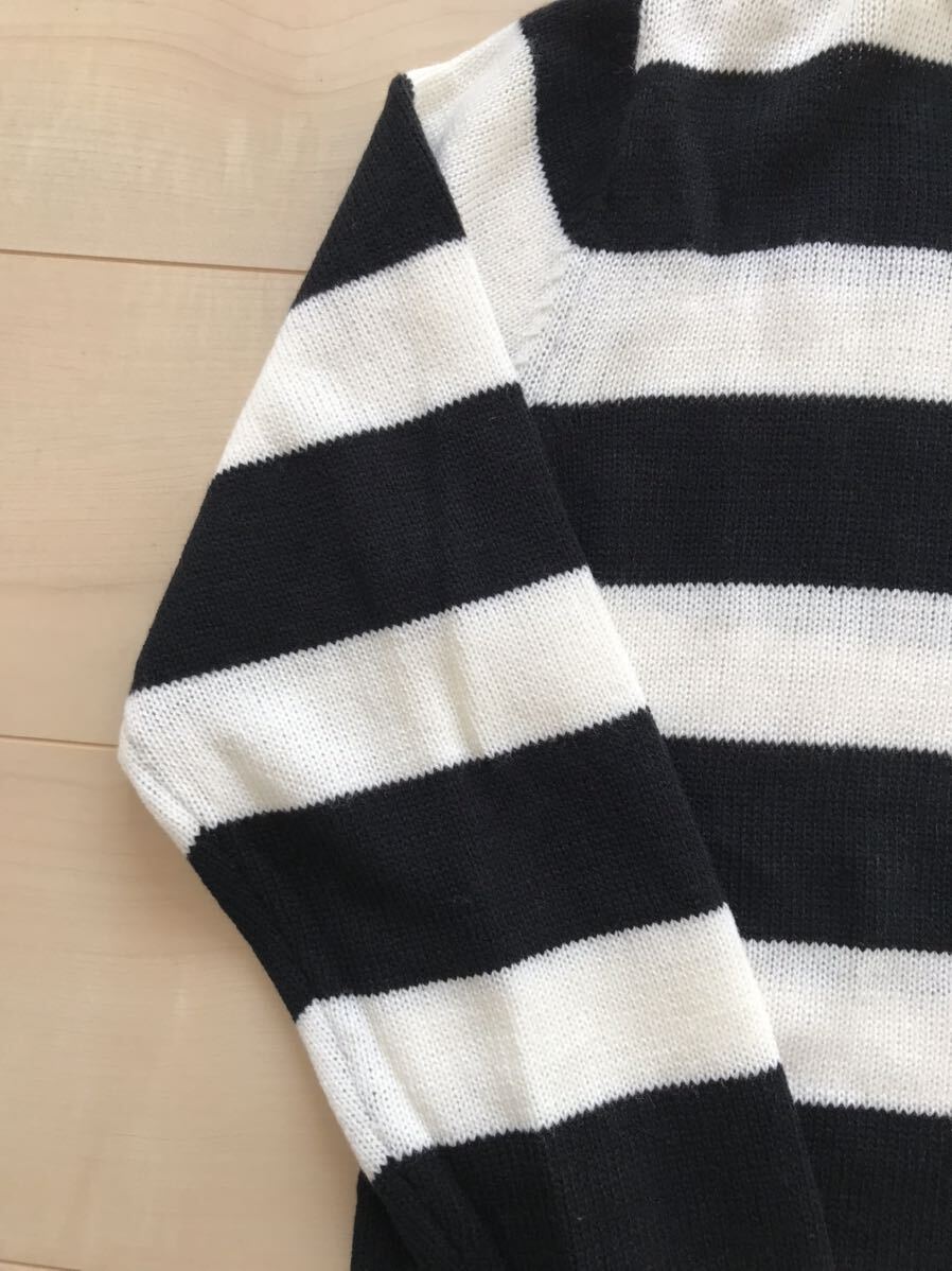備考…アクリルニットのバルキー編みボーダーでバイカラーに仕上げた長袖Vネックプルオーバー。