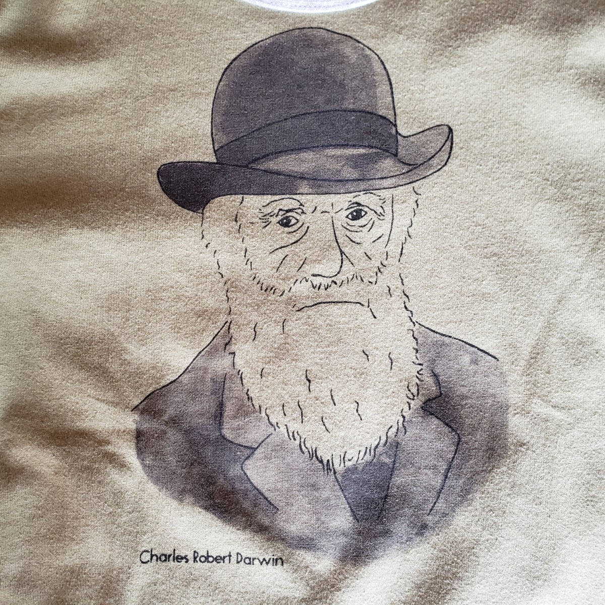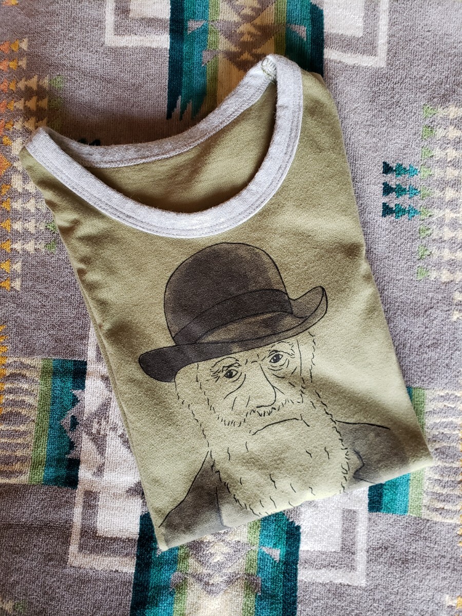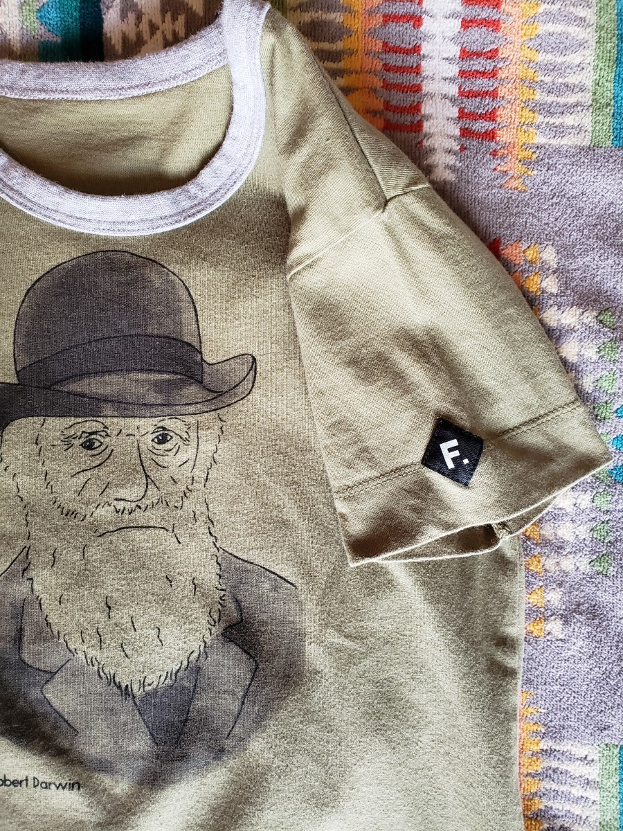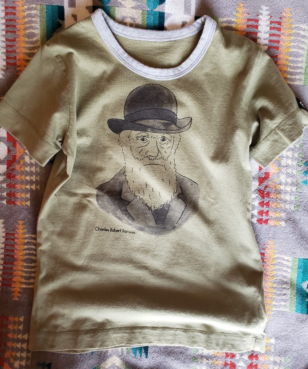 キッズサイズ(140㎝)、フェリシモで購入したTシャツ。左袖部分には「F.」マーク、フロントにはダーウィンさんの顔が描かれたかわいいデザインです。