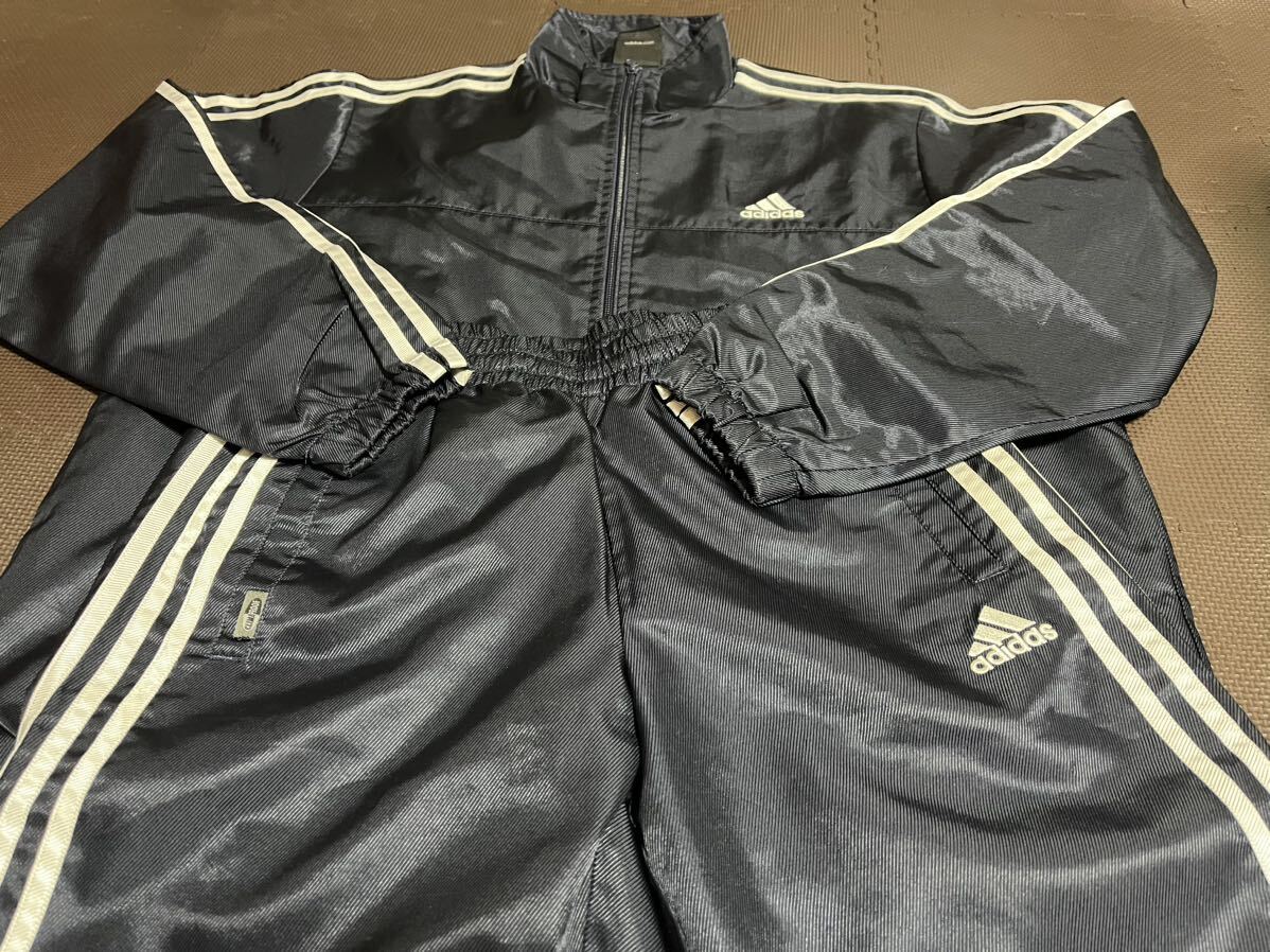 美品adidas濃紺(光沢有り)ロゴ白(刺繍)ライン白3本ウインドブレーカー上下セット