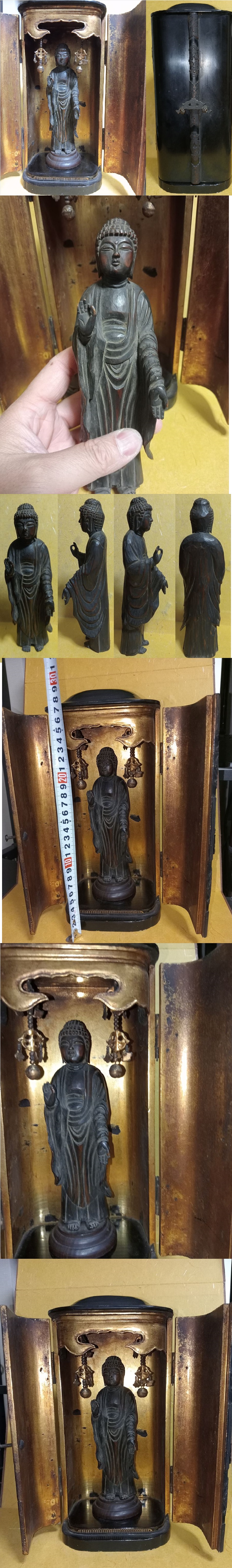時代物 秀逸 内漆箔蓮華金蒔絵 黒漆塗厨子 木造釈迦如来立像 木彫金箔蓮華仏台付 全高29cm