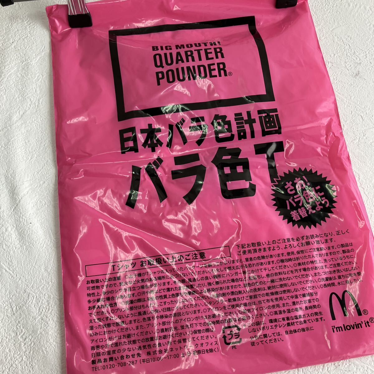 2009年、日本を元気に明るくというコンセプトのもと、バラ色でいくぜ”という「BIG MOUTH!」を掲げた「クォーターパウンダー」のキャンペーン「日本バラ色計画」の抽選でもらえたノベルティTシャツの出品です。