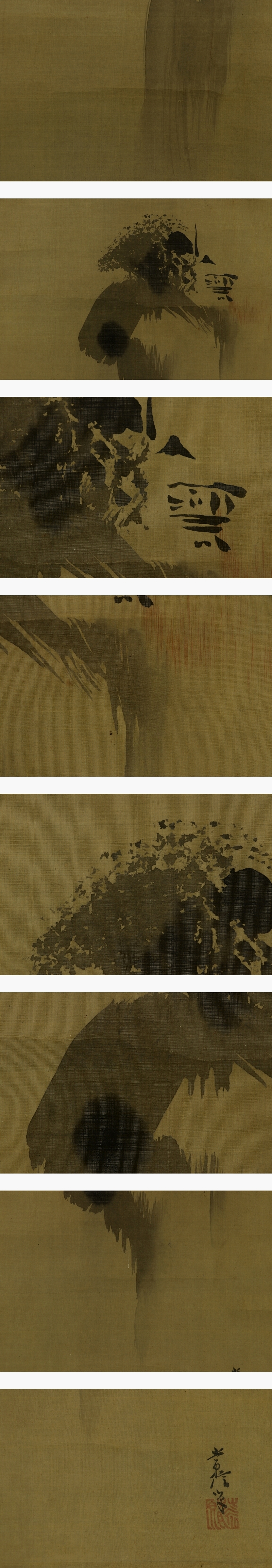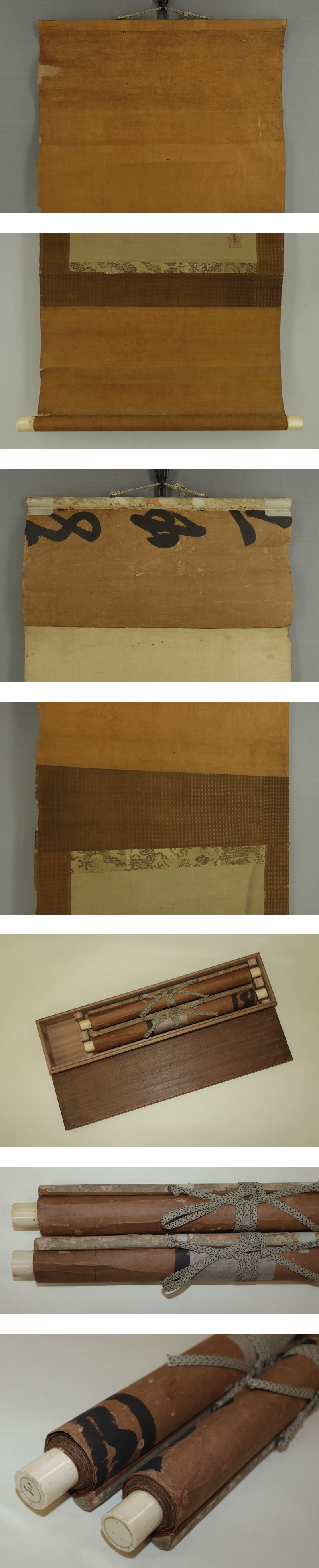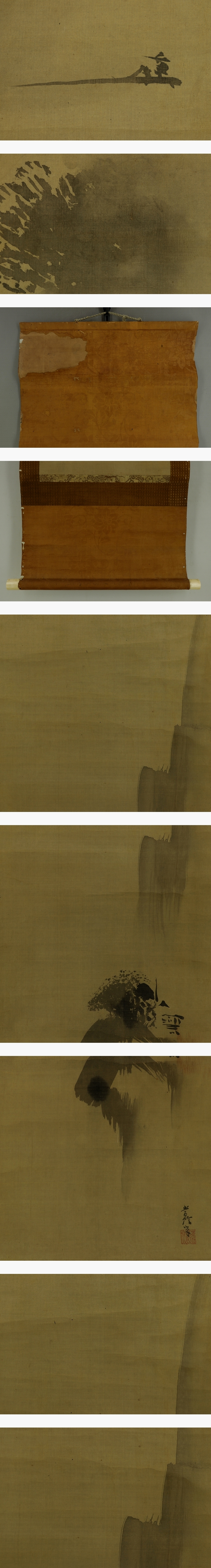狩野常信 かのう-つねのぶ(1636-1713) 江戸時代前期-中期の画家。寛永13年3月13日生まれ。 狩野尚信の長男。慶安3年(1650)父の跡を継ぐ。 御所障壁画制作に参加し,宝永年間には狩野派の最高指導者として紫宸殿の「賢聖障子」を描く。 宝永6年法印。木挽町狩野家隆盛の基礎を固めた。正徳3年1月27日死去。78歳。 京都出身。通称は右近。号は養朴,古川叟。 本紙は、染み、汚れ、強い折れ、皺、浮き、ヤケがあります。 表装は、染み、汚れ、強い折れ、皺、虫食い、破れ、ほつれ、剥れ、修理痕、軸先に汚れとヒビがあります。 【サイズ】 作品 横約30.5cm×縦約78cm 表装 横約39.5cm×縦約155cm |