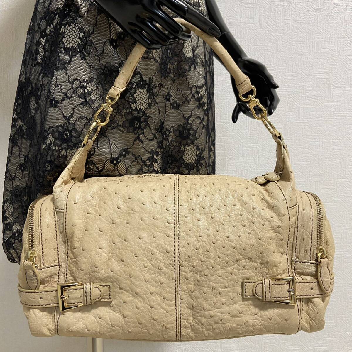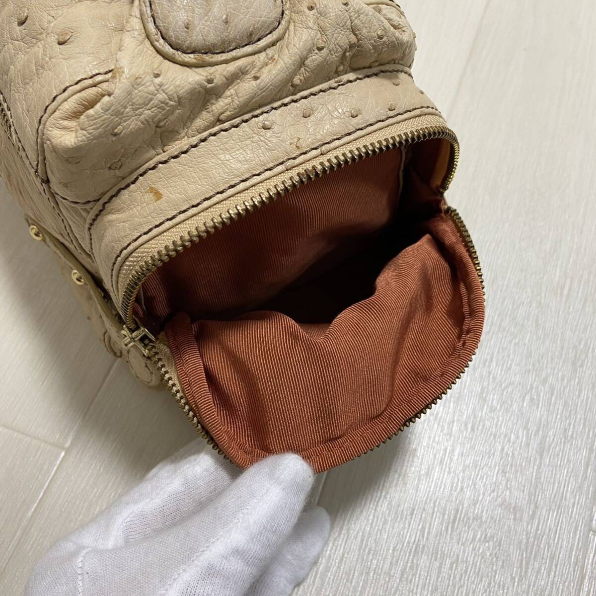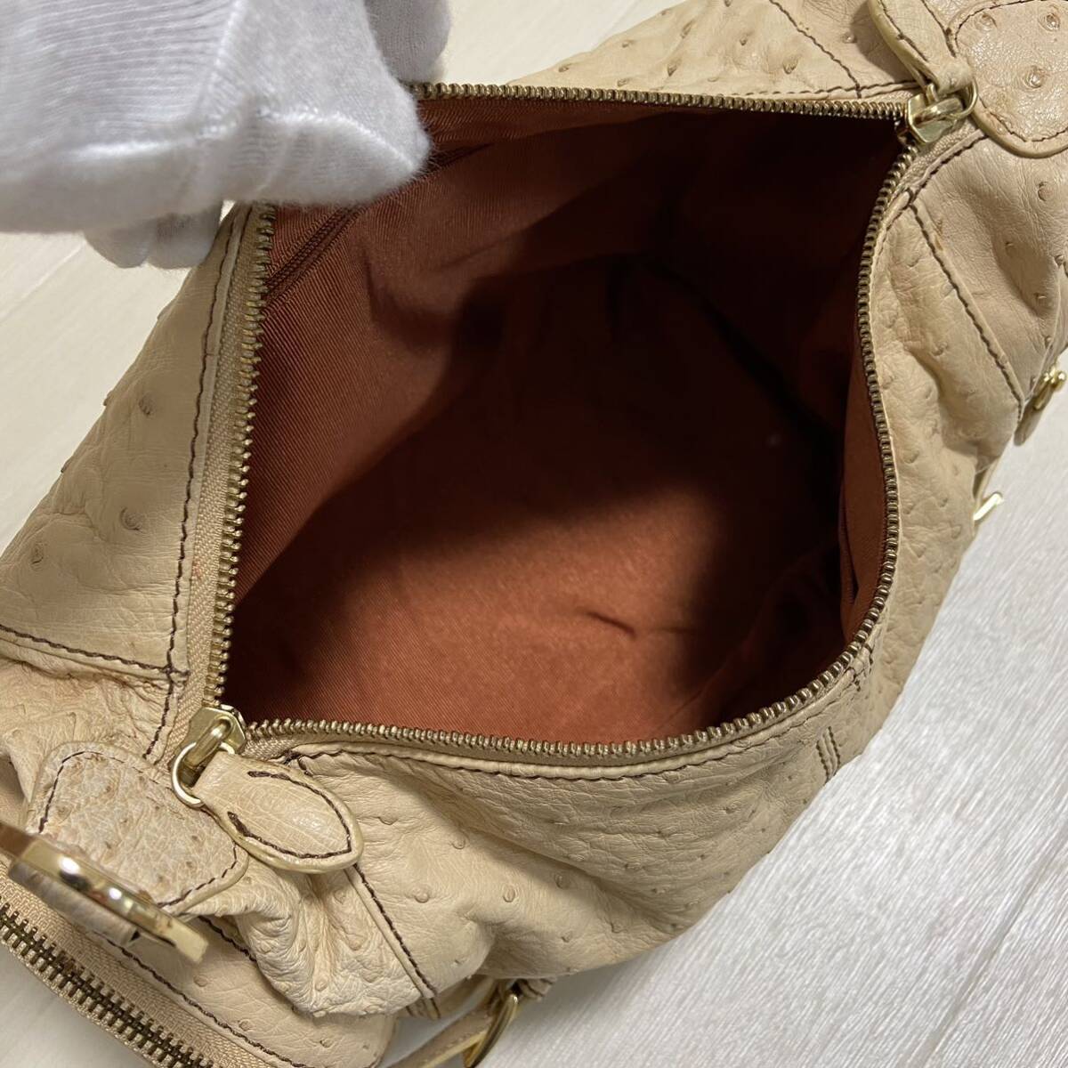 エキゾチックレザー界隈では有名なブランド。くったり上質な本物のダチョウ革。クイルマークもしっかりと出ています。マチも広く満足の内部容量。ポケット類も多く機能的。