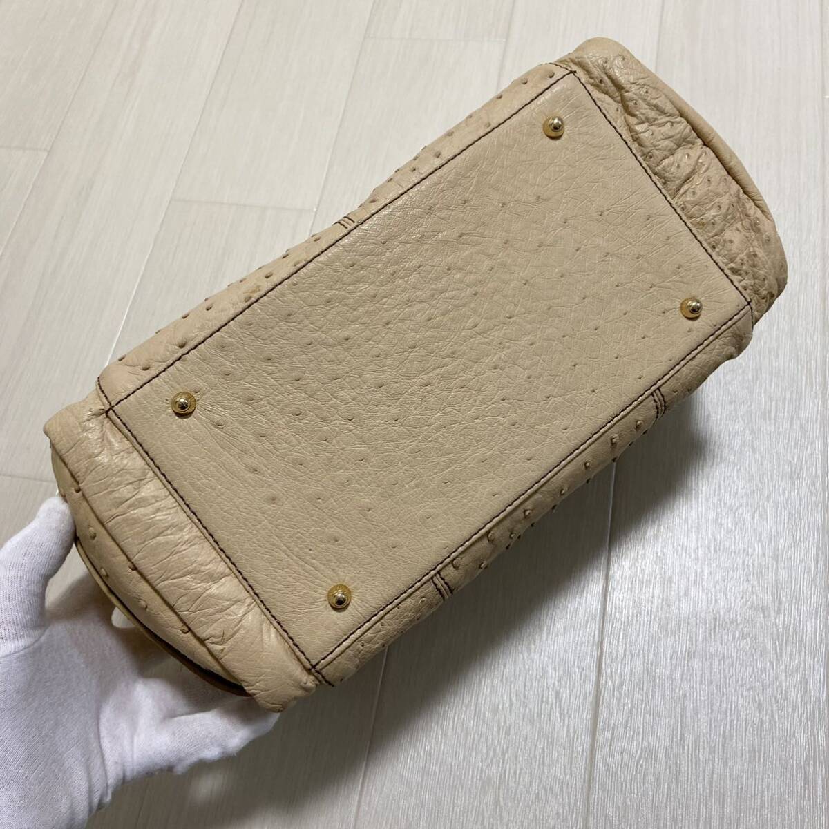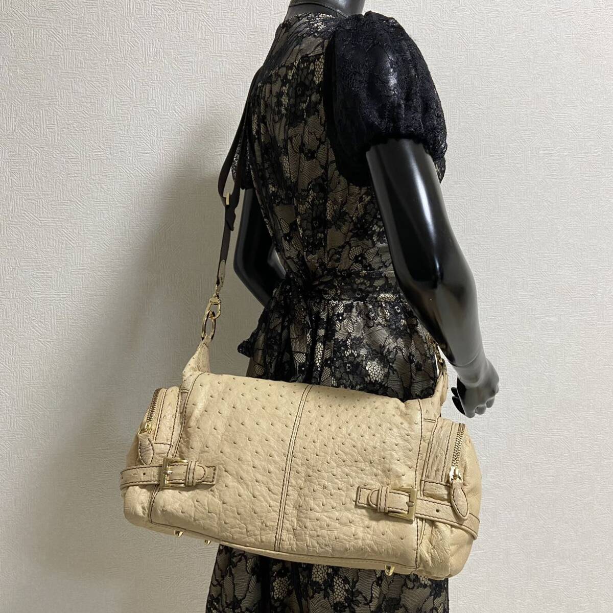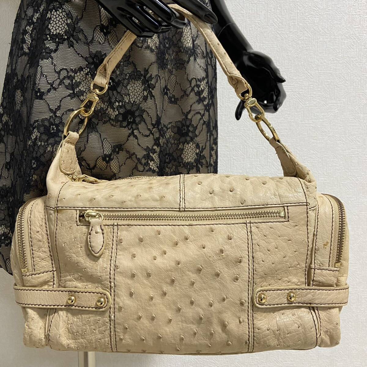 エキゾチックレザー界隈では有名なブランド。くったり上質な本物のダチョウ革。クイルマークもしっかりと出ています。マチも広く満足の内部容量。ポケット類も多く機能的。