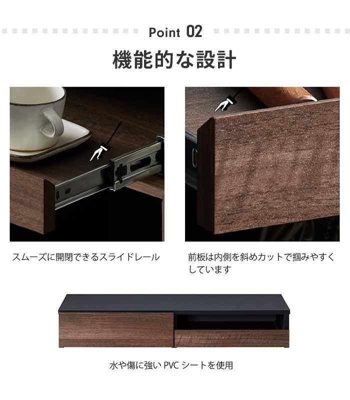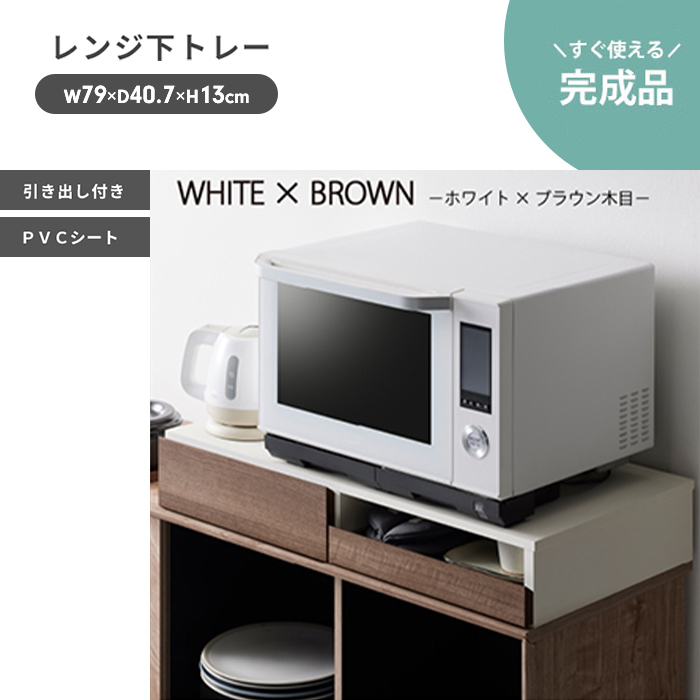 | レンジの下にちょこっと置きと収納をプラス出来る引き出し付レンジ下トレー。 トレーは必要な時だけ引き出せて、ご飯の取り分け・料理スペース・一次置きなどの作業スペースに◎ スライドテーブルは約30cm前方へ出て、ひろびろしたスペース。 引き出しは必要なキッチン用品などをすっきり収納出来ます。 フルスライドレール採用で出し入れスムーズ。 ブラック・ブラック×ブラウン・ホワイト・ホワイト×ブラウンの4色展開。 |