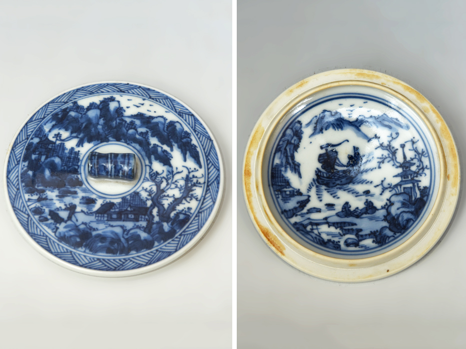 淡青な染付で楼閣山水文様が描かれており蓋裏にまで緻密に絵柄が描かれております。 器形はやや細く、姿も良く優美な水指です。 共蓋の摘みには竹が細工されております。 底部に銘あり。 美品でキズ等なく良い状態です。 ※撮影の際に生じた写り込みなどがございます。 ご理解の程よろしくお願い致します。 |