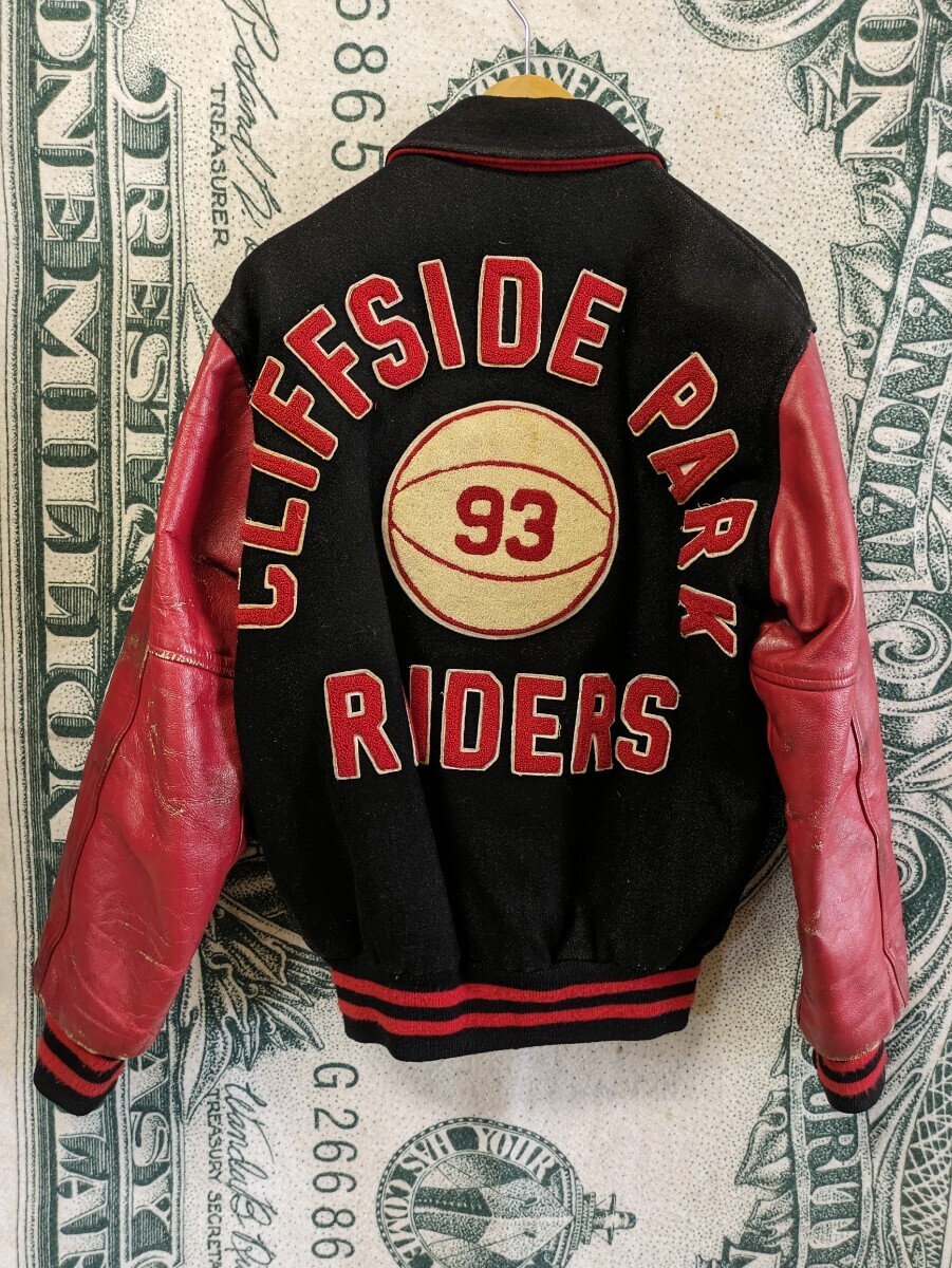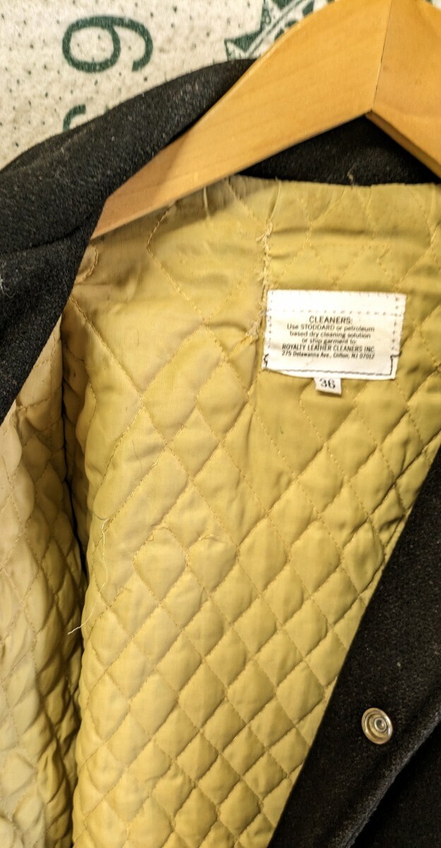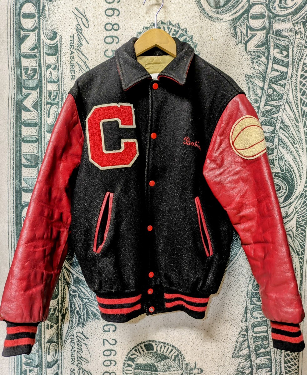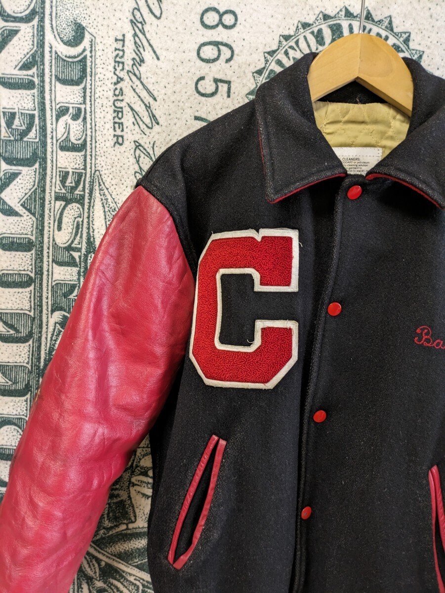 70年代USA製サガラワッペン付きアワードJKTの出品。サイズ表記36。実寸は着丈約68センチ、身幅約58センチ、肩幅約48センチ程度。colorは黒×赤の2トーン。ウールボディーにレザー袖のアワードジャケット。ハンドウォーマーポケットにはレザーのパイピング、キルティング裏地、サガラワッペン、ワンポイント刺繍などのディテール。レザーの質感も柔らかく硬化なしのコンディション。スナップボタンも欠損なし。格安での出品ですが古着及びヴィンテージ、オークションでのお買い物にご理解ある方のみ自己紹介欄を一読のうえNCNRにてのご入札でお願いいたします。