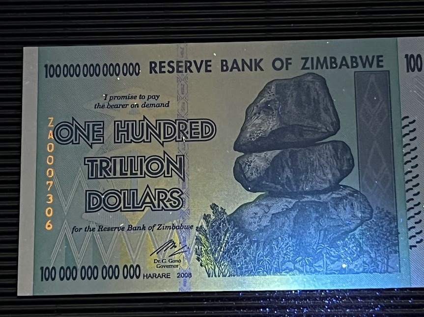 〇ジンバブエで、2009年1月16日に発行された、ハイパーインフレ時の最高額面、100,000,000,000,000ドル=100兆ドル紙幣になります。(紙幣には2008年の印刷記載が見られます。)