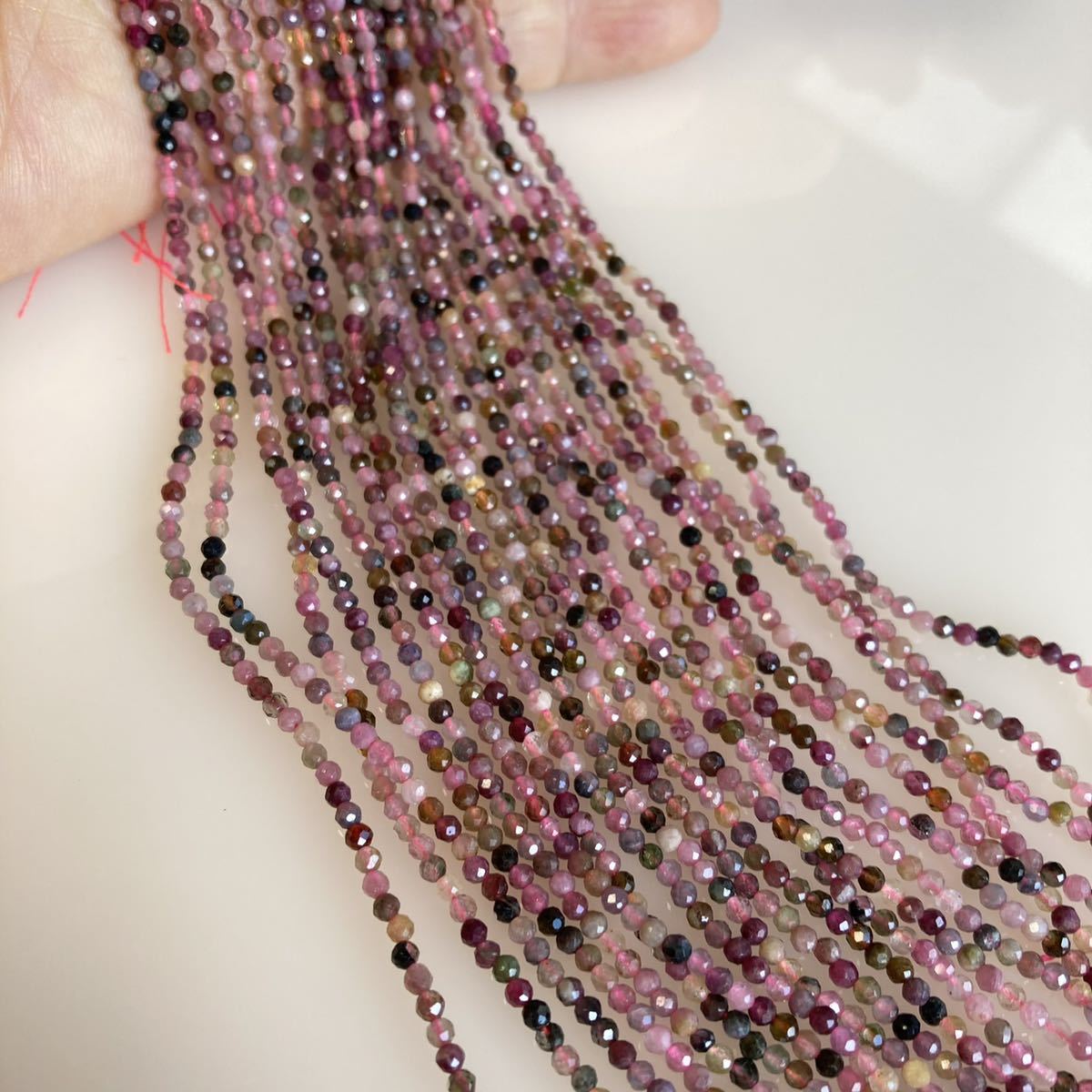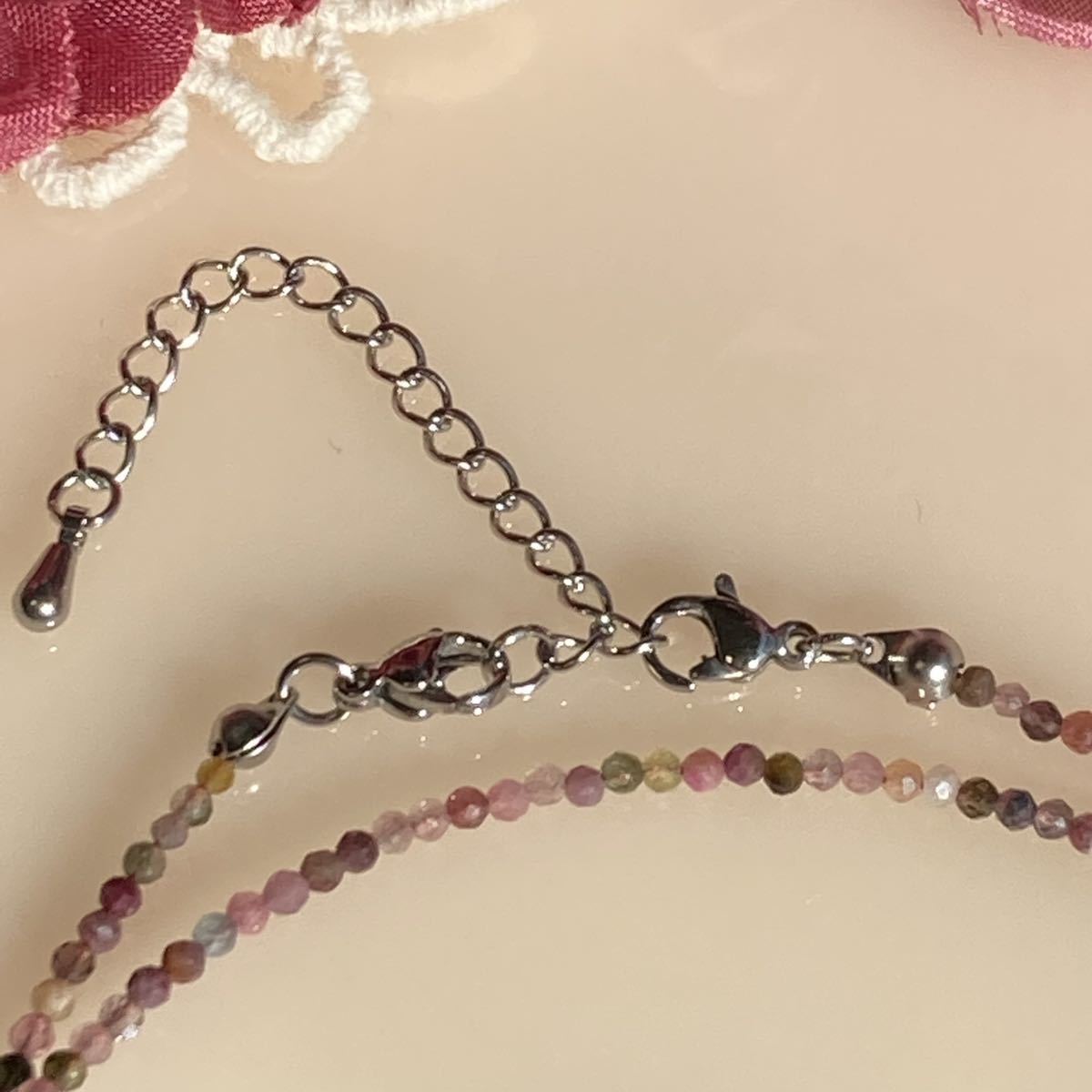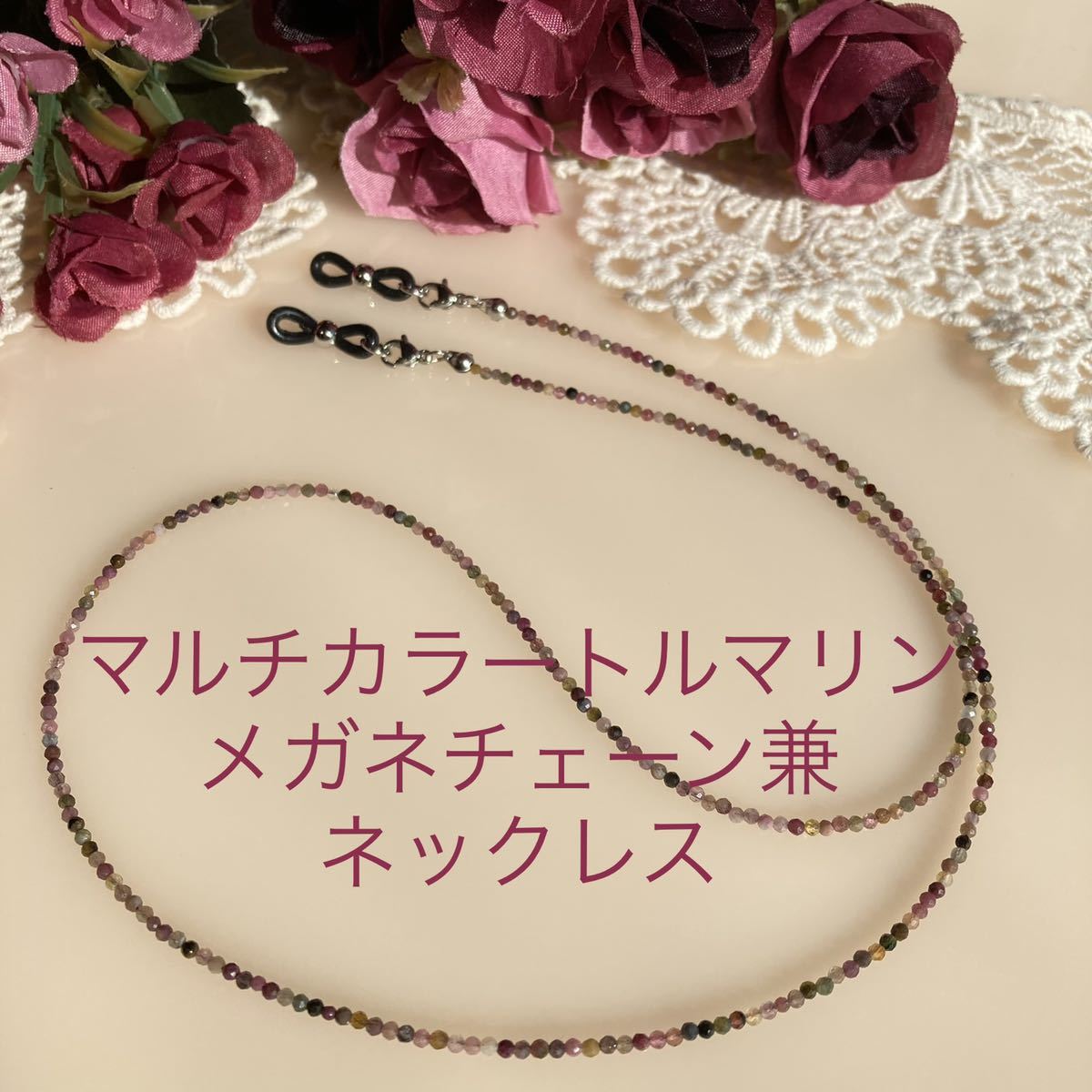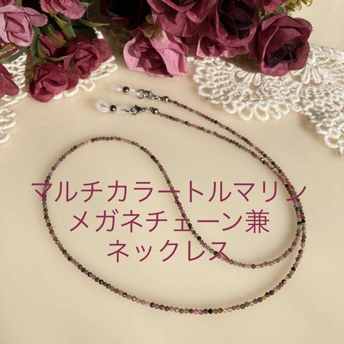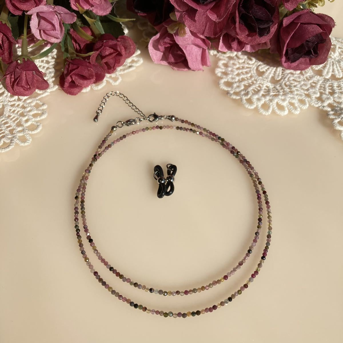 ピンク、イエロー、グリーン、ブラックなど、様々な色合いを楽しめるマルチカラートルマリン2mmカット珠使用のメガネチェーン兼ネックレス。