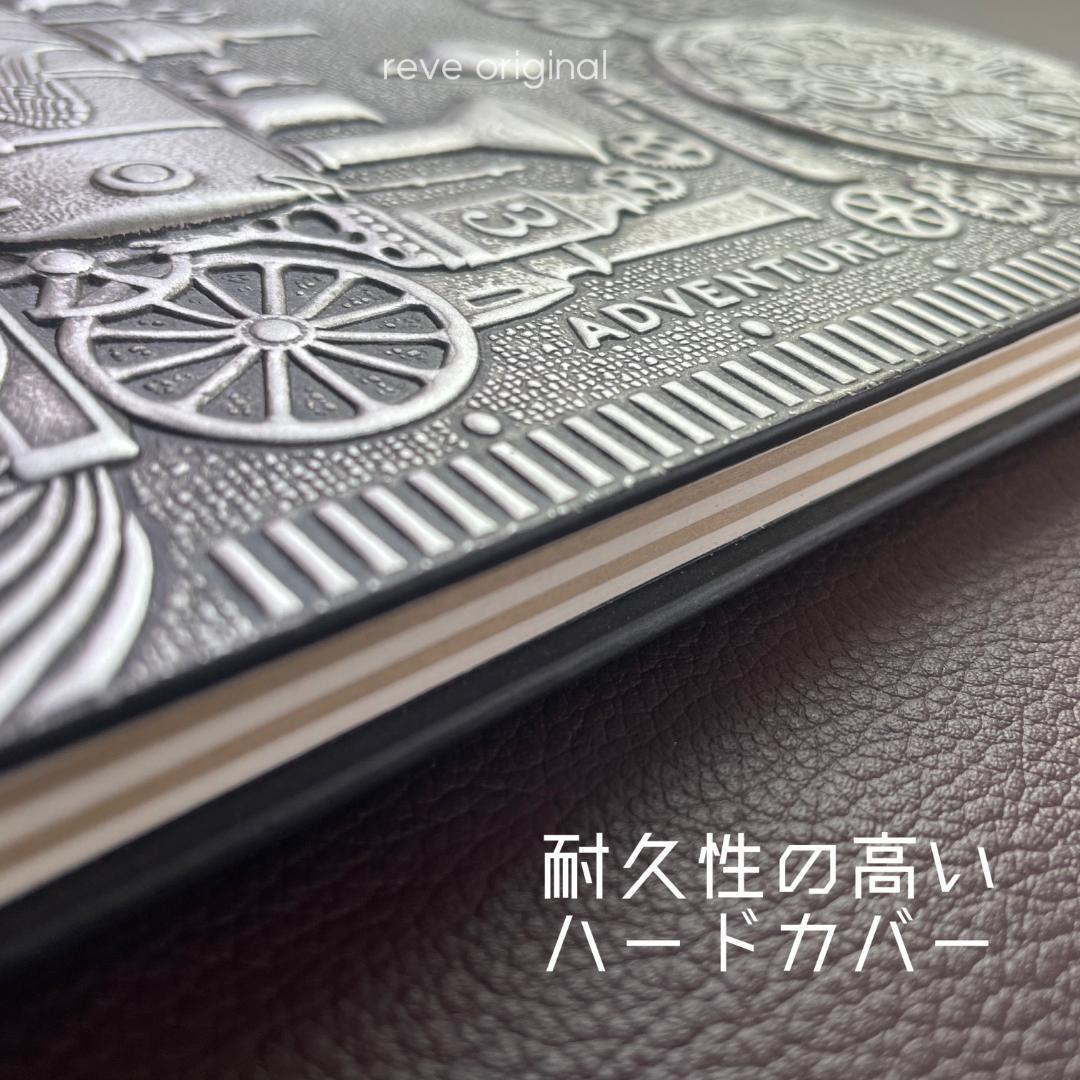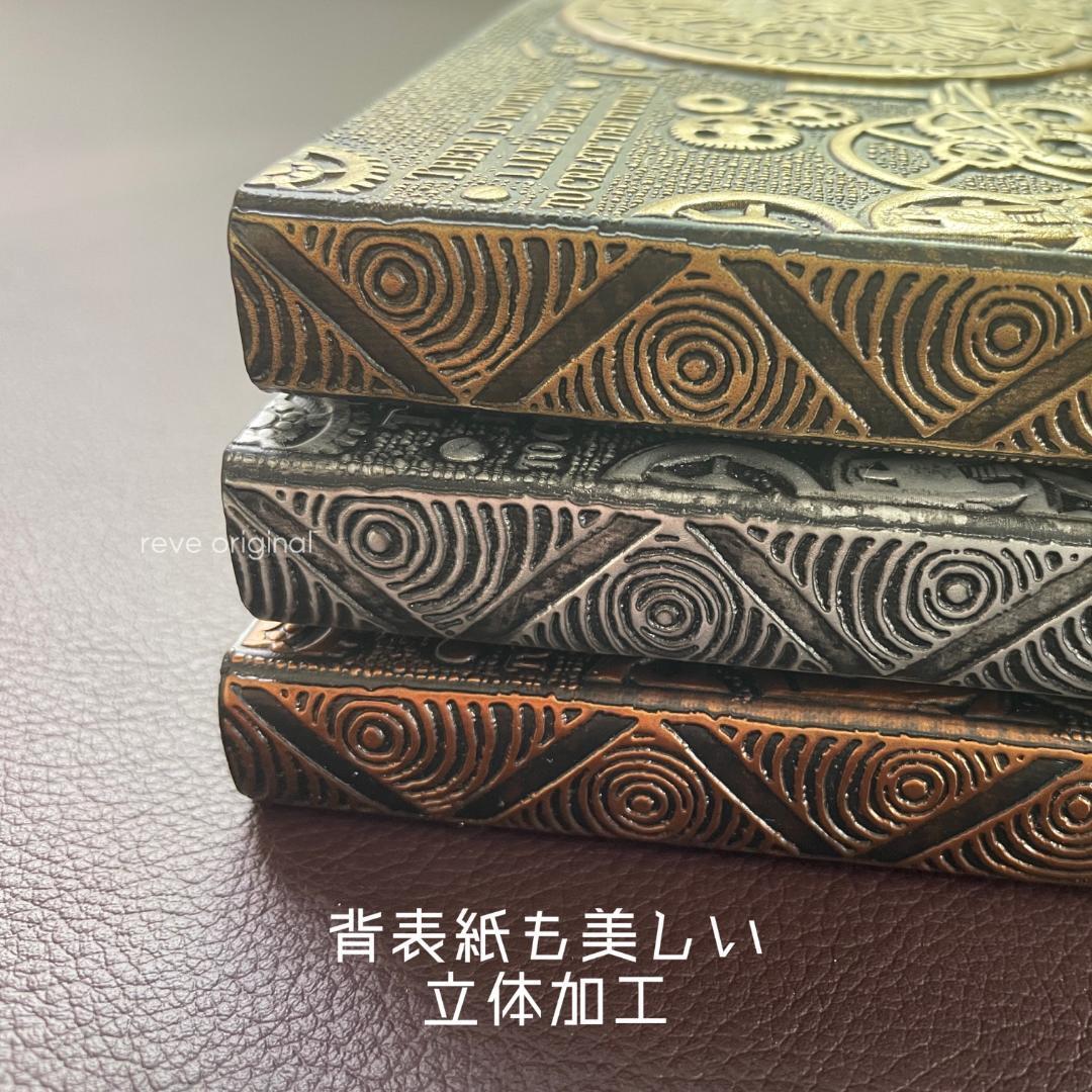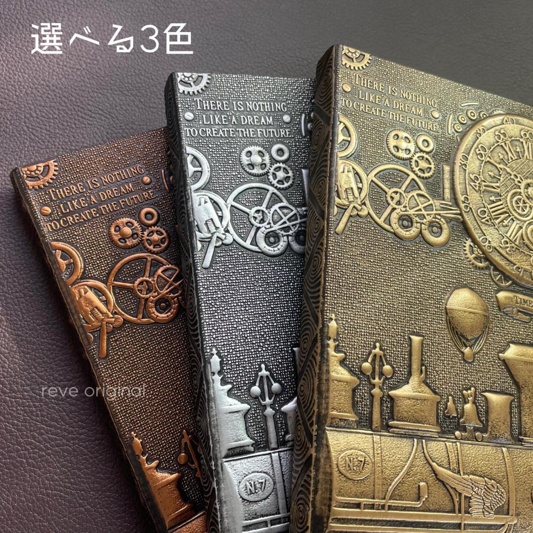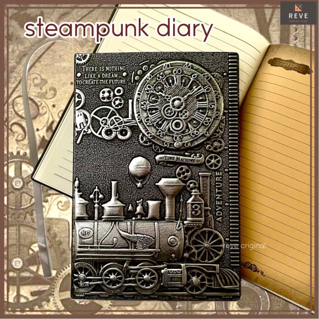 レトロな時代にタイムスリップ出来そうな、機関車のタイムマシーンや、ヴィンテージな懐中時計などを、立体エンボス加工した、高級感のあるスチームパンクテイストのダイアリーです。