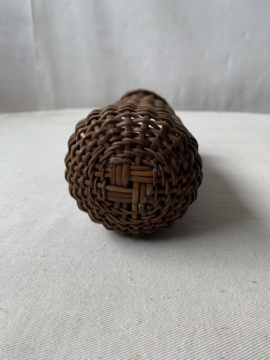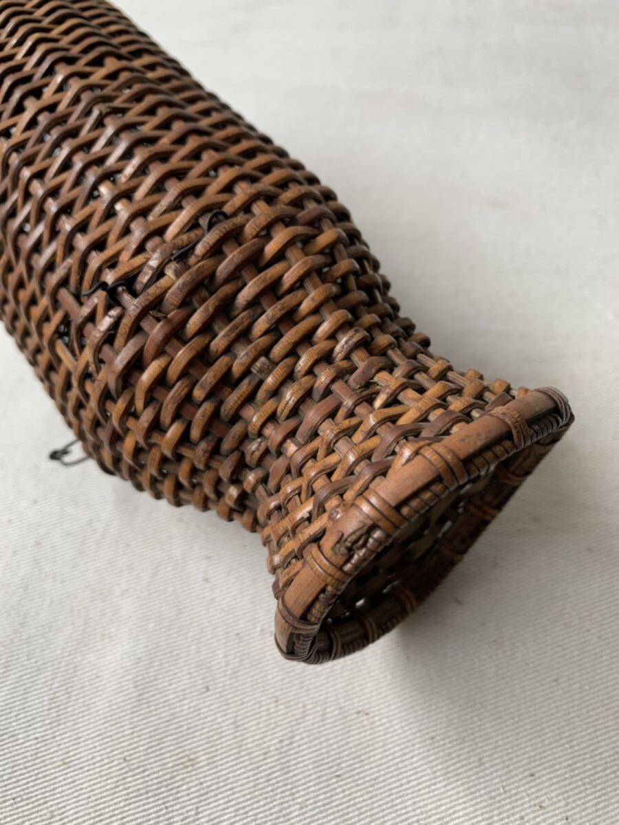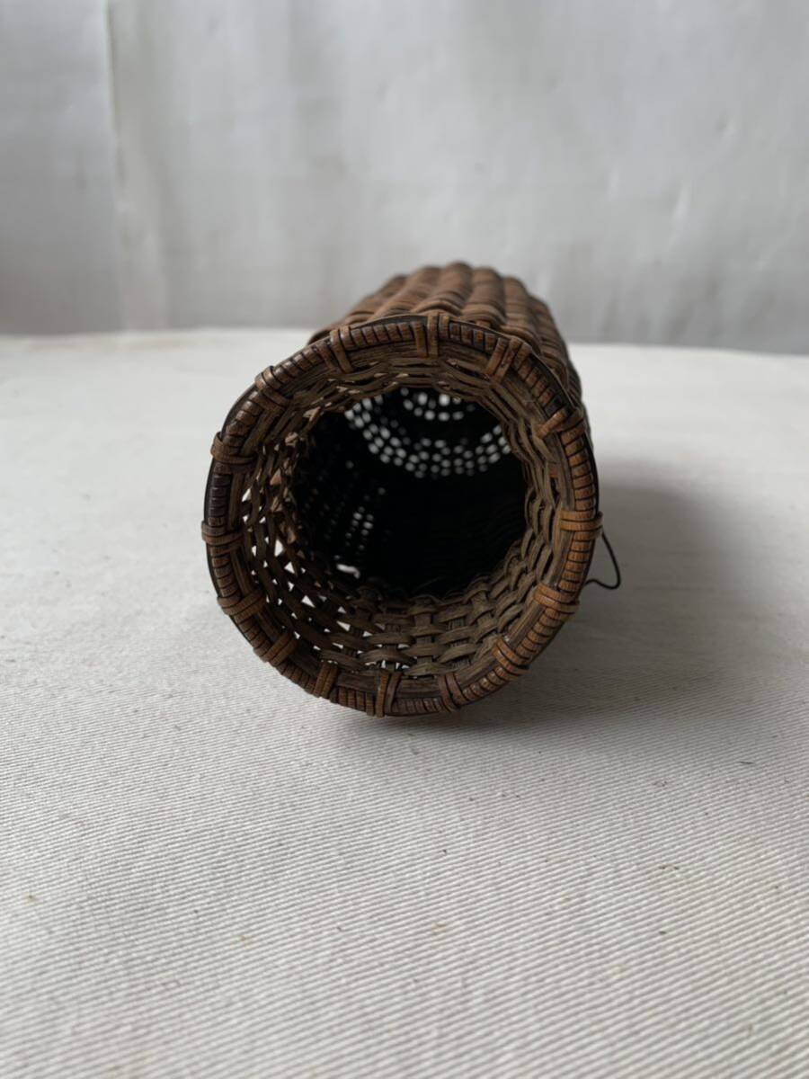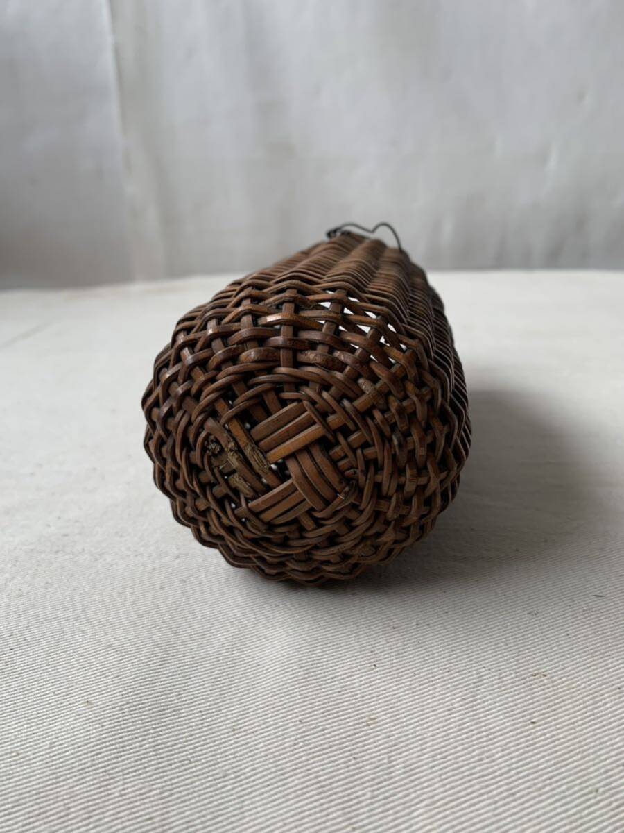 経年の雰囲気が素敵な竹編みカゴです。壁掛け出来る様に針金が付いています。花器としてお部屋のインテリアやお店のディスプレイに使って頂くと素敵だと思います。天然素材の味わいを楽しむ空間演出にいかがでしょう。
