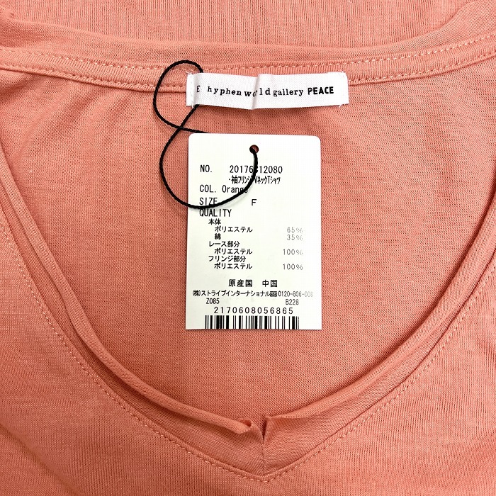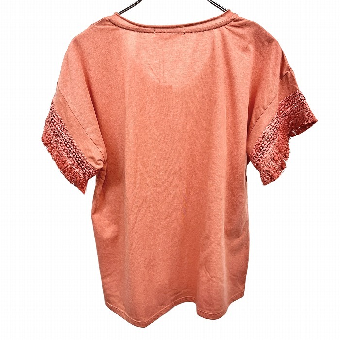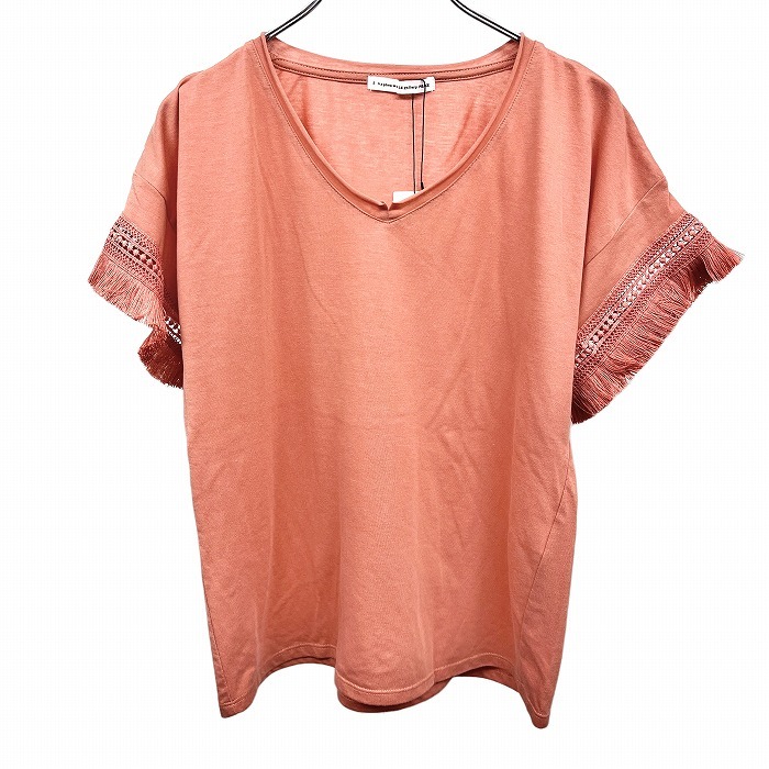 | 商品タイトル | イーハイフンワールドギャラリー 【新品】 Tシャツ 袖がレース×フリンジ Vネック 半袖 無地 ポリ×綿 F ヘザーサーモンピンク レディース |