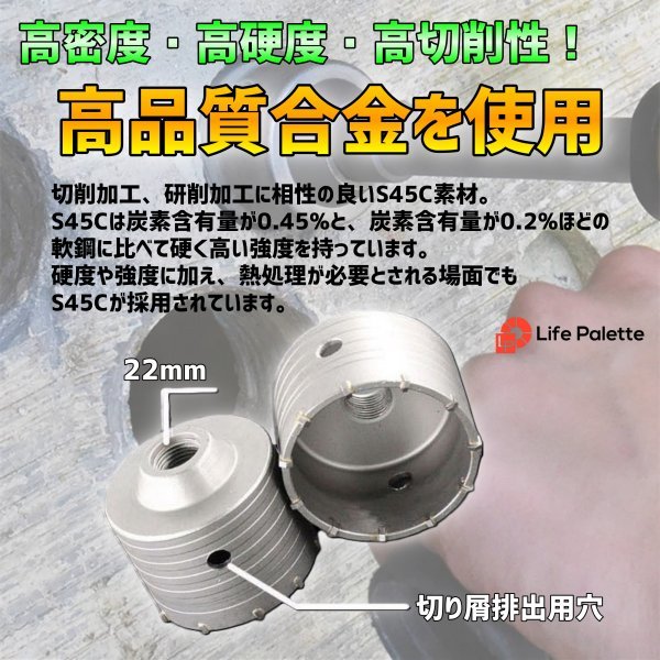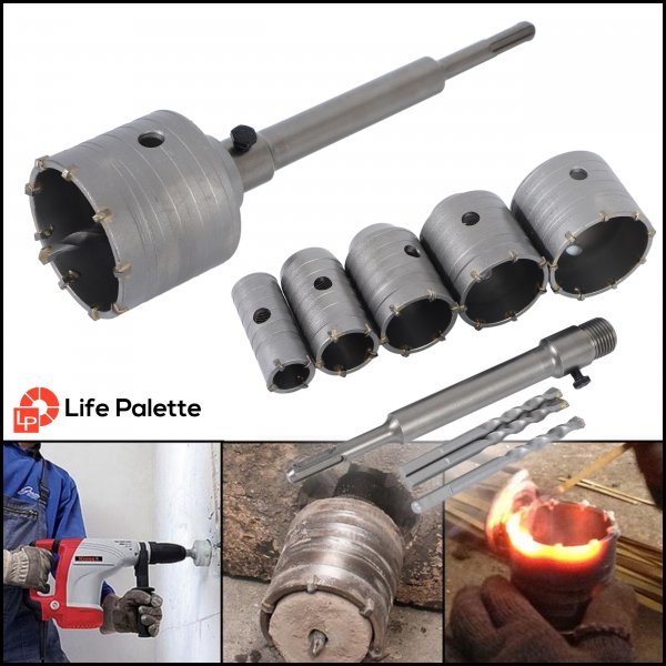 | ライフパレット製品 お得 売れ筋 コンクリートドリルセット 30mm 40mm 50mm 60mm 70mm ホルソー ホールソー 穴あけ SDSプラス 工具 モンタル レンガ 外壁 ALC YF44 新品 送料 全国一律1500円 ☆超硬チップ付き!耐摩耗・耐久性に優れたコンクリートドリルビットセット!!☆ 多くのお客様から大変御好評頂いている商品です!! 【作業現場で大活躍!ドリル5サイズ&ロングシャフトセットセット】 エアコンや換気扇などの取り付けのための貫通穴や、水道管・ガス管などの配管工事の貫通穴をあける工具です。 振動ドリル・電気ドリルなどに装着してご使用になれます。 強力な打撃力と回転力のスムーズな伝達により、鉄筋コンクリートをスピード穿孔します。 【使用頻度の高い5サイズを激選!お得なセット】 セット内容: コアドリル 30mm×1 40mm×1 50mm×1 60mm×1 70mm×1 SDSプラスアダプター(20cm)×1 センタードリル×3 【20cmロングシャフト&センタードリル付き】 使用頻度の高い5サイズをセットにしました。 30mm、40mm、50mm、60mm、70mmのお得なセットで作業現場で活躍すること間違い無しのアイテムです。 センタードリル付きで位置決めも楽々♪ 20cmのロングシャフトでデッキプレートのインサート下穴あけや、アンカー施工、障害物などがある場合に威力を発揮します。 【高品質合金使用!高性能ドリル】 切削加工、研削加工に相性の良いS45C素材。 S45Cは炭素含有量が0.45%と、炭素含有量が0.2%ほどの軟鋼に比べて硬く高い強度を持っています。 硬度や強度に加え、熱処理が必要とされる場面でもS45Cが採用されています。 【幅広い用途で使える♪万能ドリル】 幅広い用途、材質に使える業者様ご用達のドリルセットです。 コンクリートやモルタル、ブロック、タイルなどセメント系の材質や、レンガ、大理石、御影石など石材に効率的に穴あけを行います。 冷暖房、電気、ガス、水道、回線工事における鉄筋コンクリートの穴あけや、陶器瓦や燻瓦などの粘土瓦、セメント瓦、洋瓦など屋根工事にも最適。 【SDSプラスシャンク&取付方法】 SDSシャンク軸を採用。 ハンマードリルは力強い打撃力が魅力のパワフルな工具です。使いこなせれば作業の幅がぐっと広がります。安全に十分に留意しながら正しい使用方法でご活用ください。 =サイズ= 穴幅:約30mm、約40mm、約50mm、約60mm、約70mm | |||