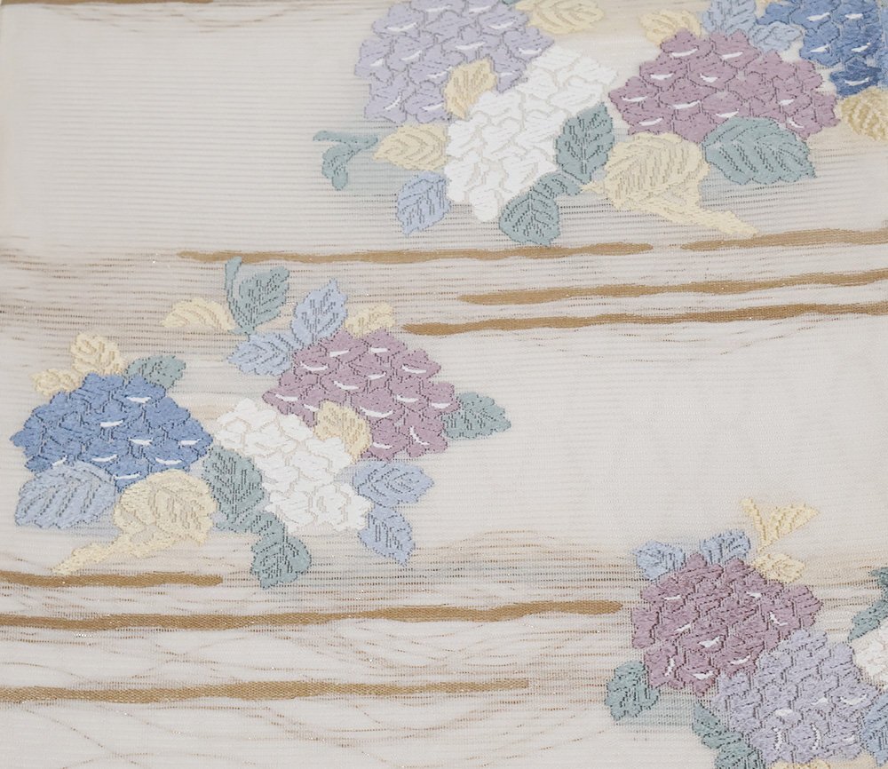 | 絽 西陣織袋帯 ベージュ・赤茶・横縞・網目地模様地 唐織・紫陽花 新品 仕立て上がり | |