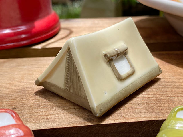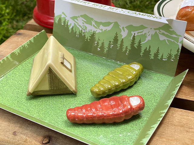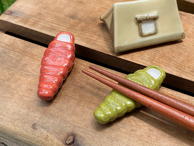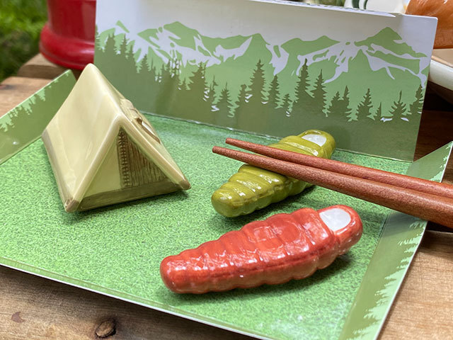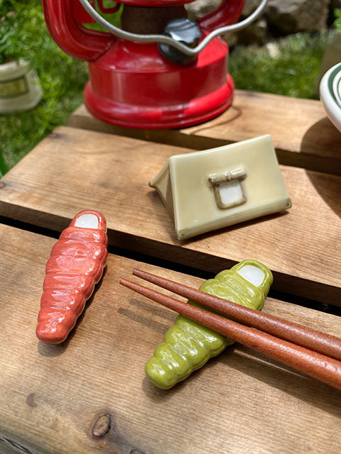 今や旅先のおみやげ物屋さんで、色んな箸置きを目にしますが、きっとキャンプギアをモチーフにしたってヤツは初めてなはず!
