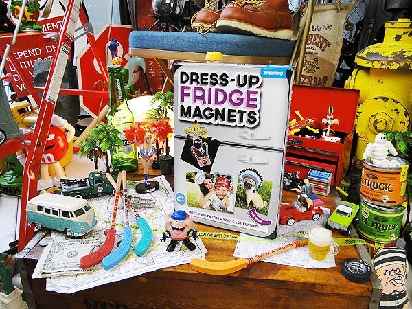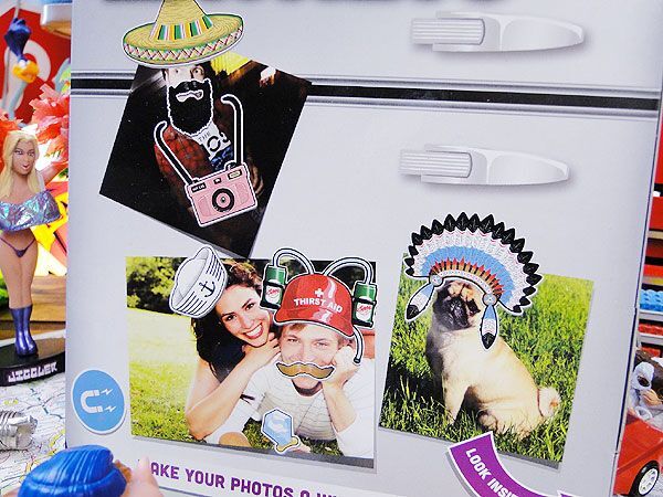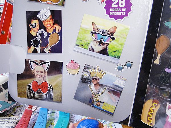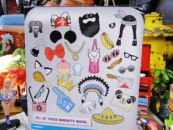 冷蔵庫に写真を貼るのってアメリカではド定番なんですが、その写真を変装させちゃおうってユニークな商品がこちら!その名もドレスアップ・フリッジマグネット!髪型や帽子、ヒゲにアクセサリー、インディアンの羽などなど・・・・28種類の変装マグネットが収録されていて、写真の上から重ねるだけでおもしろいフォトが完成しちゃうという優れものです。実際、自分の知ってる顔ぶれでやると思いの外に楽しいんです。親子や兄弟はもちろん、友達から可愛いペットまでおもしろおかしく変身させちゃえ!(≧∀≦)/