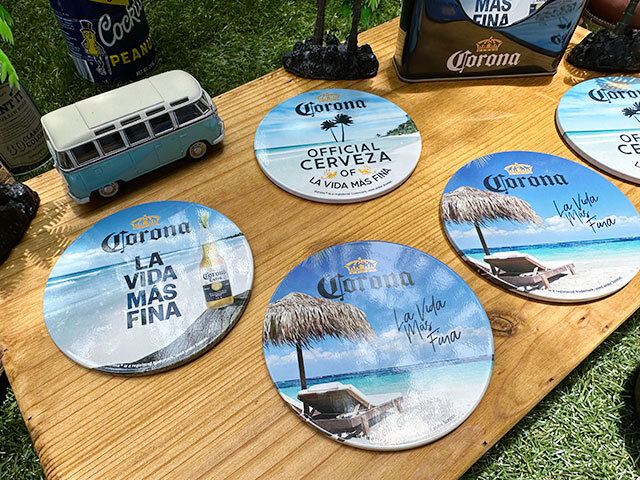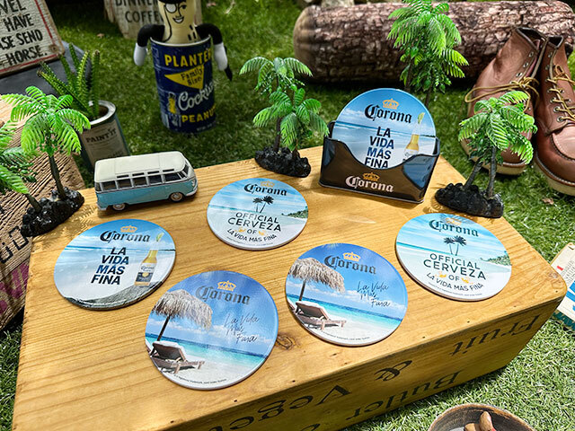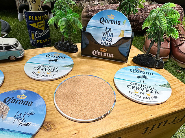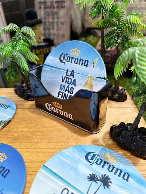 爽快なビーチをバックに、コロナの伝統のロゴがデザインされたブリキ製コースター(6枚セット)です。