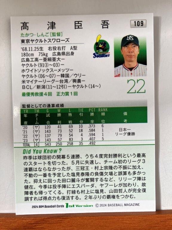 【2024 BBM 1st】109髙津臣吾(東京ヤクルトスワローズ)レギュラーカード