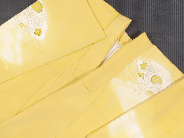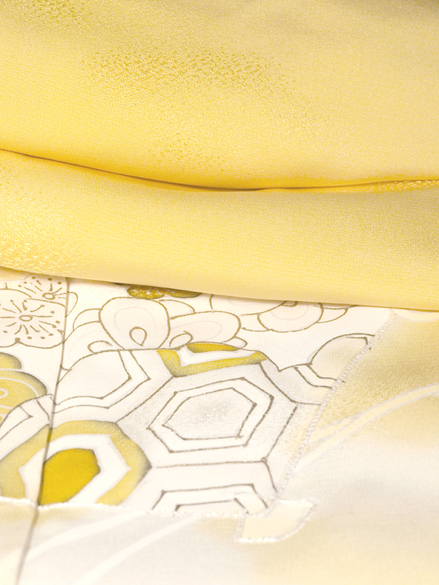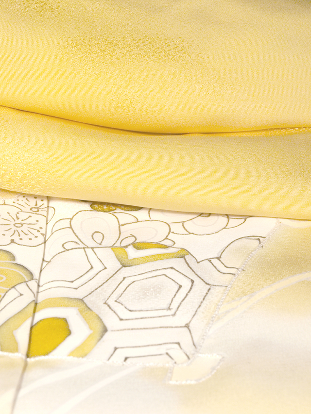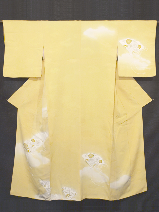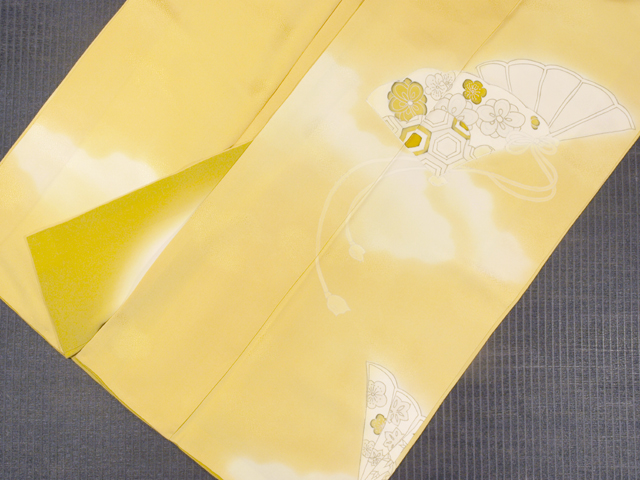 中黄色の地に、雲霞(うんか)の地紋が織り出され、同じく雲霞と花や小紋の配された檜扇(ひおうぎ)の文様が染められている紋意匠縮緬の付下げ訪問着です。袷仕立てです。 舞い散るような檜扇が意匠に動きを与えています。とてもなめらかな手ざわりの上質な縮緬地です。 ユーズド品ですが、使用感はあまり感じられません。左後袖のたもとへり上と左前袖の袖山の袖付直近に長さ約 5mm-1cm のうすよごれが各 1 か所あります。そのほかに目につく大きなしみやよごれ、褪色などのダメージはなく、全体的にはきれいな状態なので、気にされない方であればご着用可能と思われます。お手入れに出していただければ、ダメージはきれいになりそうです。 |