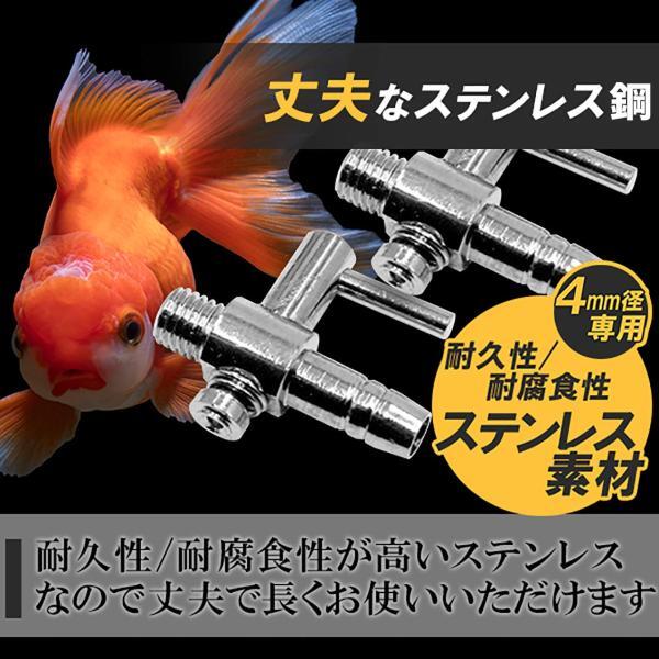 このレバーバルブは耐久性や耐腐食性が高いステンレス鋼なので丈夫で長持ち。接続口は4mm径のエアチューブ専用です。分岐チューブを使えばエアポンプ1つで複数の水槽のバブルを調整できるので大変便利です。