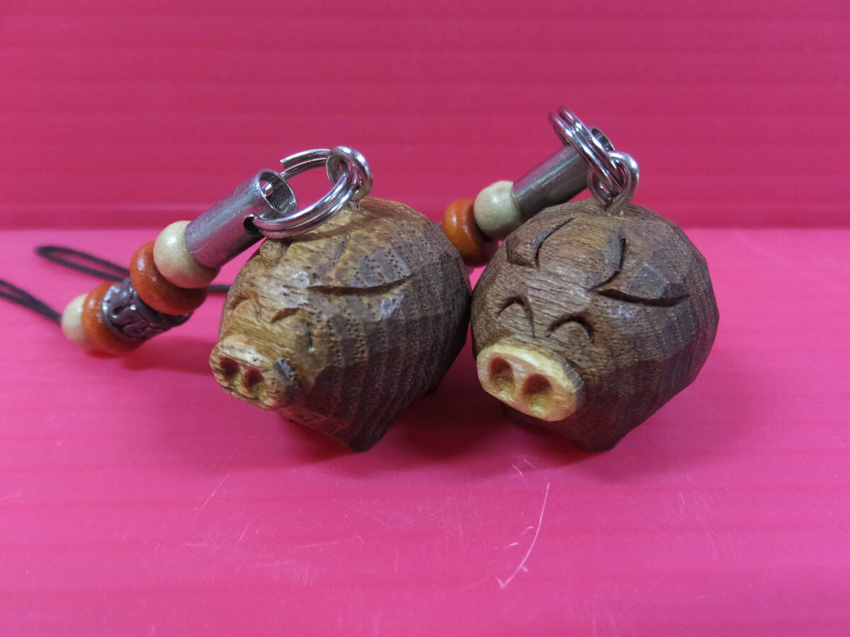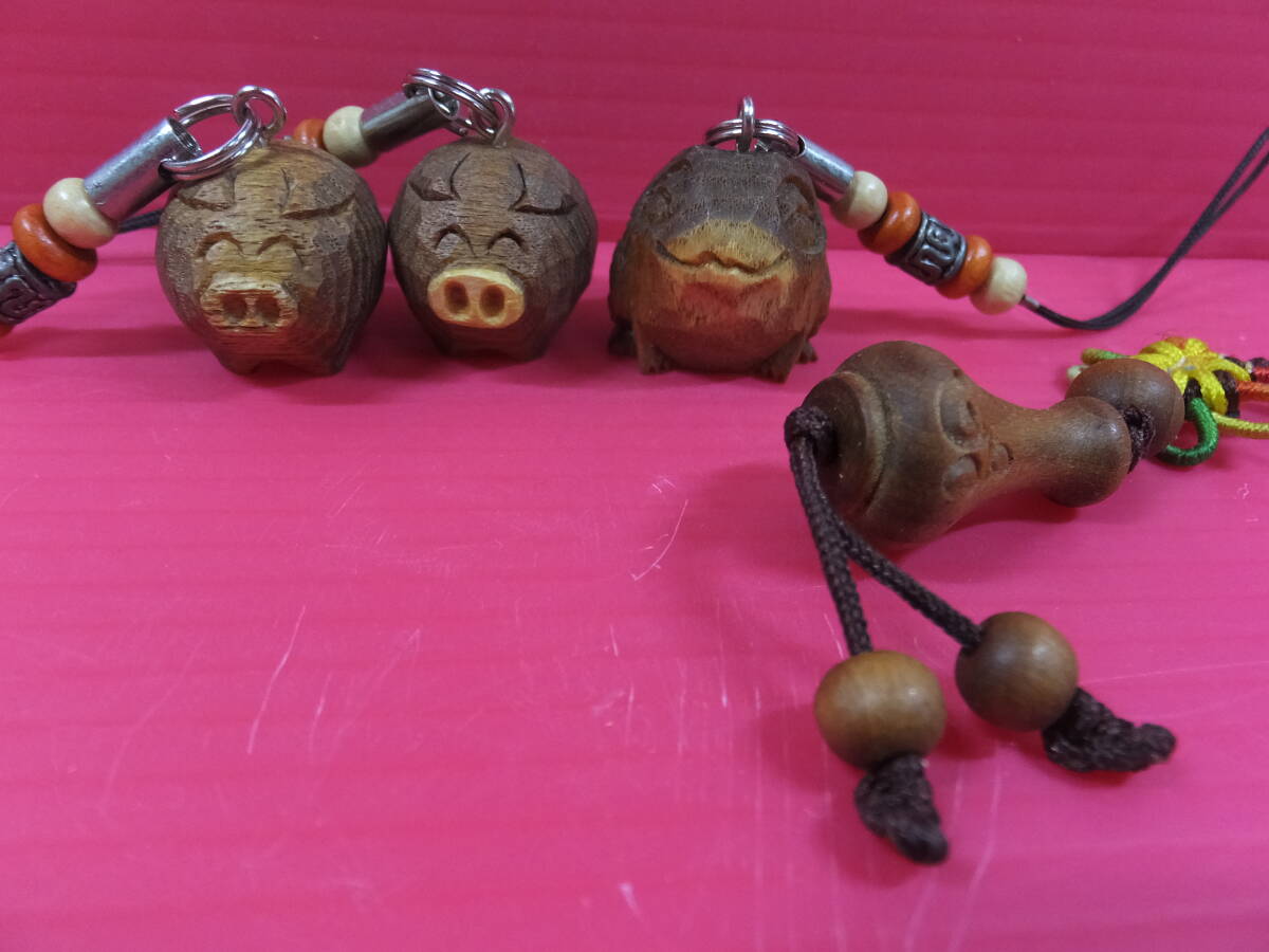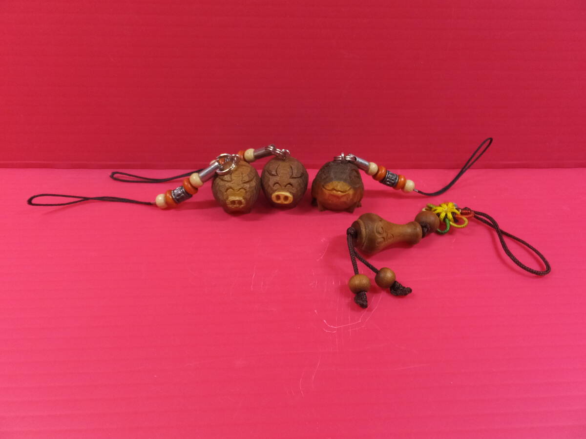 木製 木工芸品 木彫りのブタ 2匹 / 木彫りのカエル 1匹 / 木彫りのおちょこ? 1個 ストラップ 中古