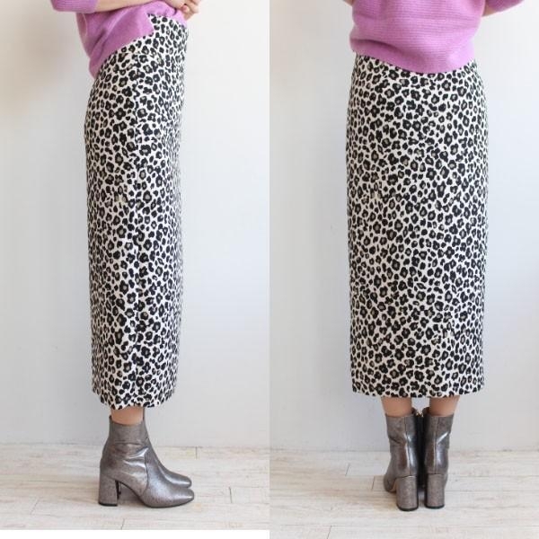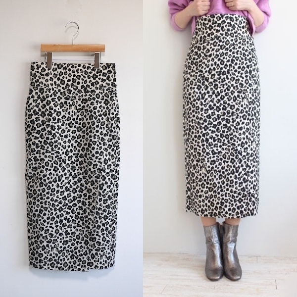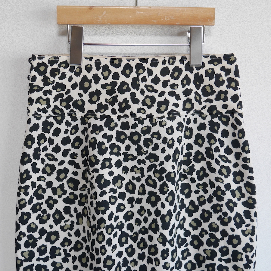 薄手のポリエステル素材を使用した落ち感のあるレオパード柄スカート。 すっきりとしたIラインシルエットで、ウエストボタンをあえて掛け違えてアシンメトリーに穿いても可愛いです。 定価16500円です。