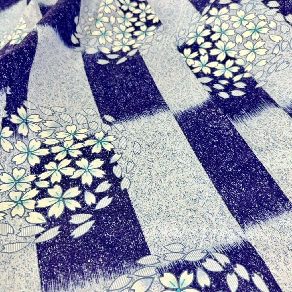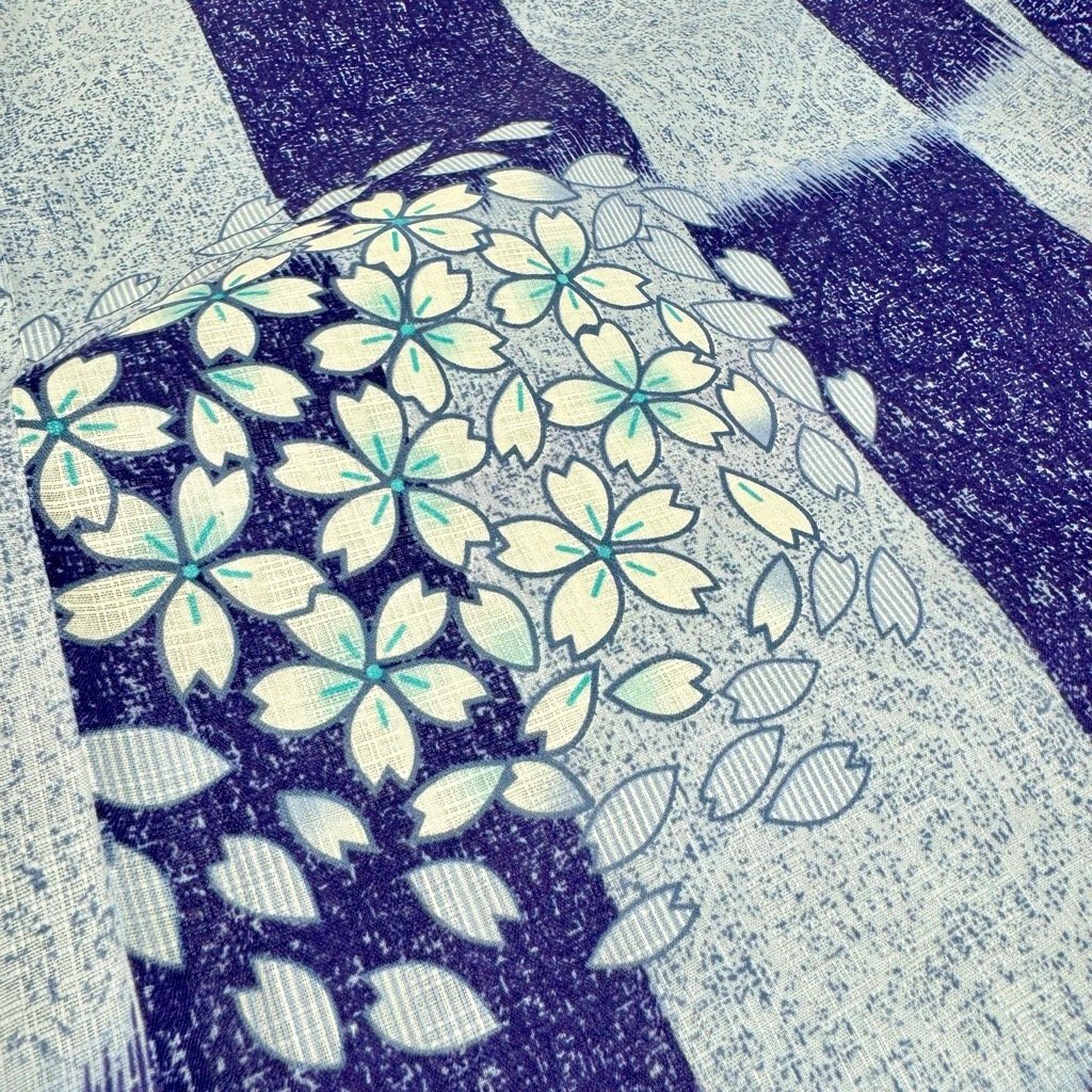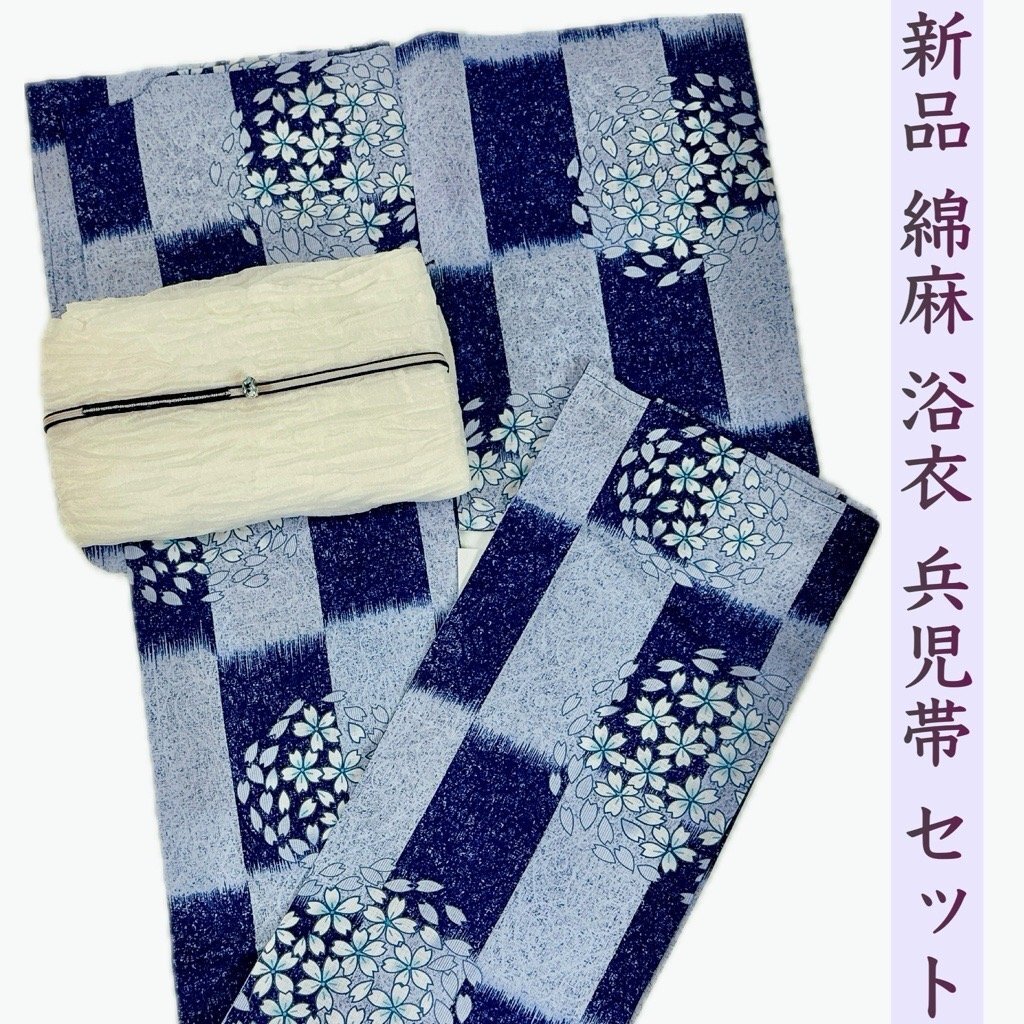 着物さと ② 新品 綿麻 浴衣 兵児帯 2点 セット フリーサイズ 身丈 163cm 桜 花弁 サクラ 市松 水色 紫 白 アイボリー 未使用 美品