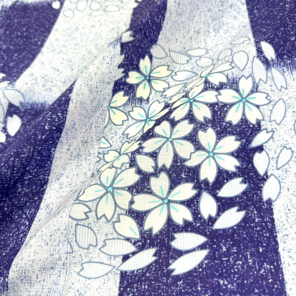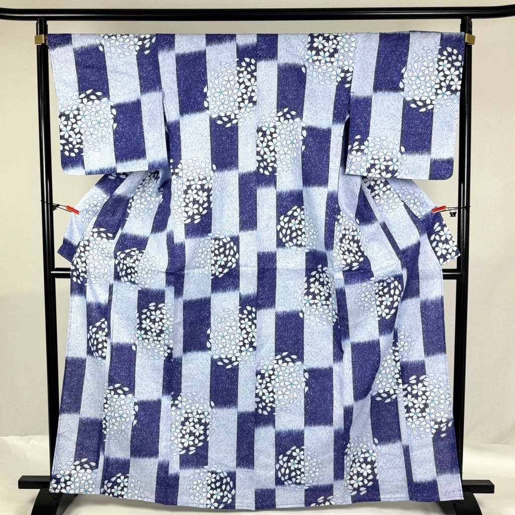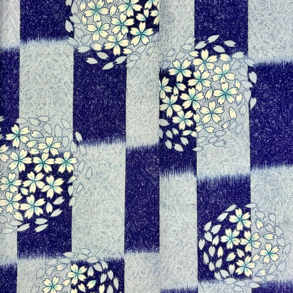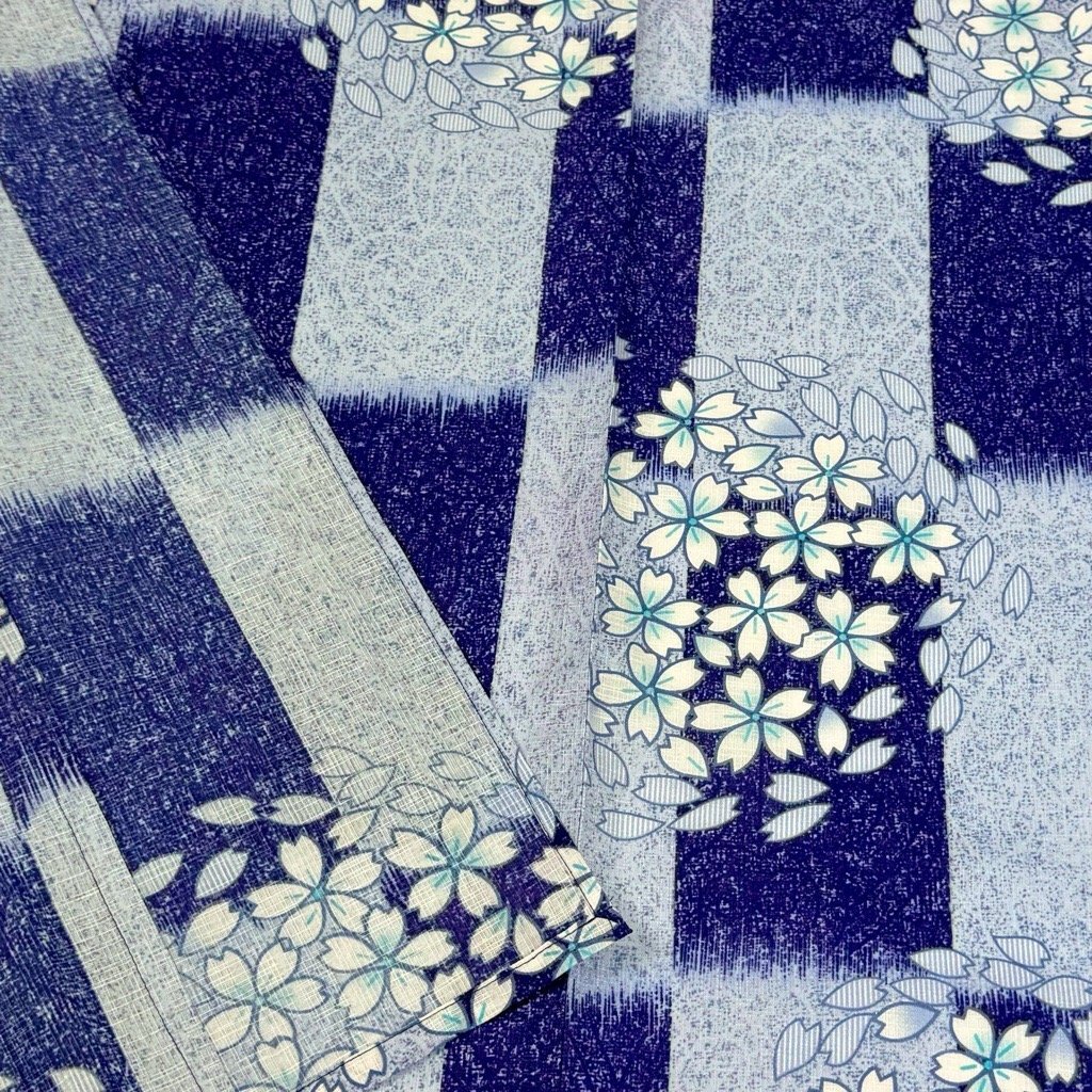 着物さと ② 新品 綿麻 浴衣 兵児帯 2点 セット フリーサイズ 身丈 163cm 桜 花弁 サクラ 市松 水色 紫 白 アイボリー 未使用 美品