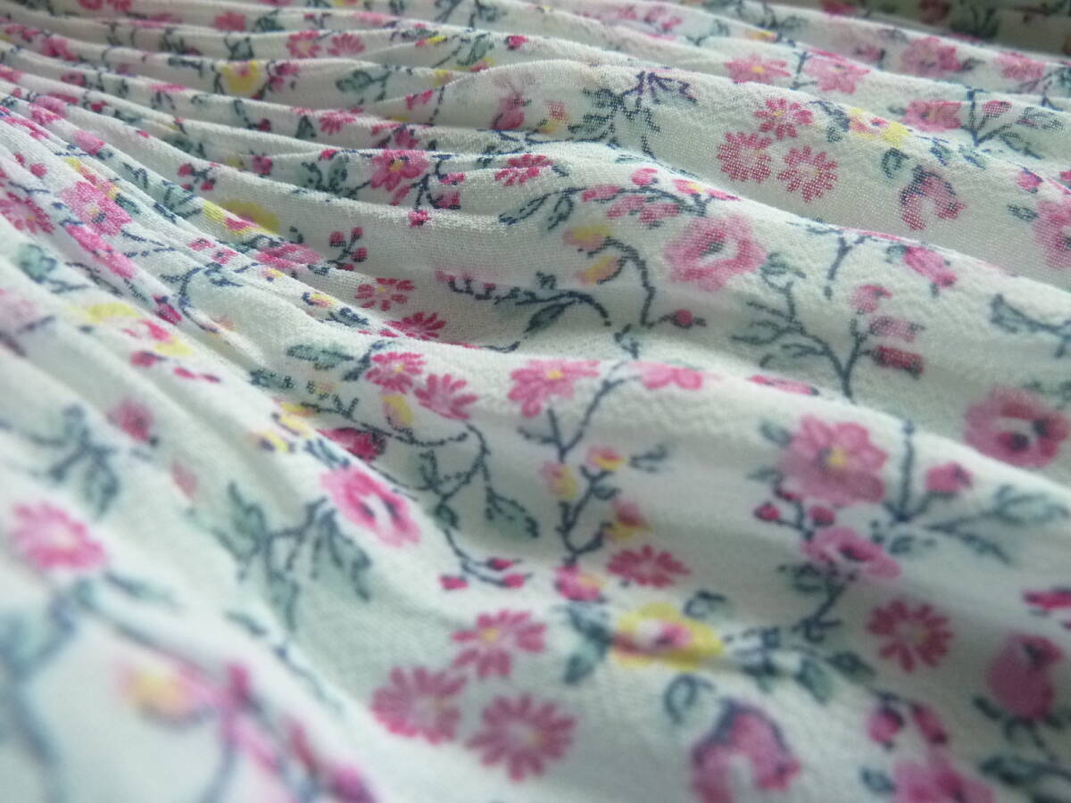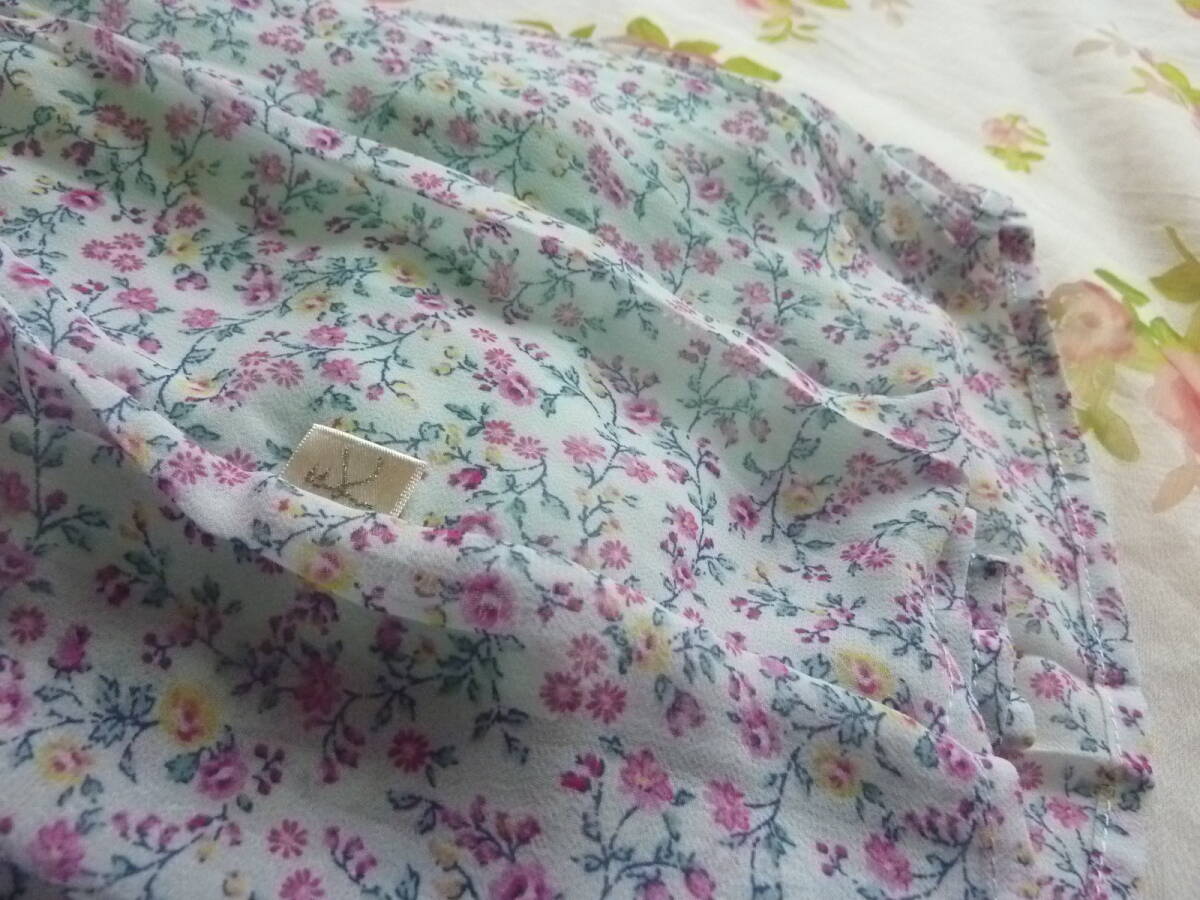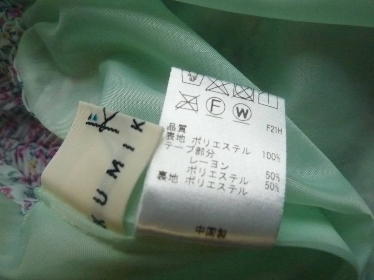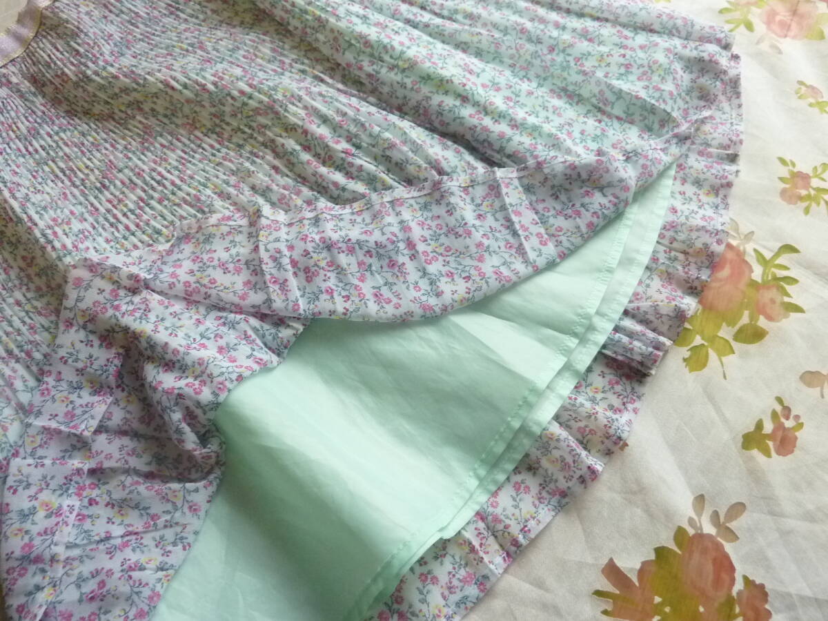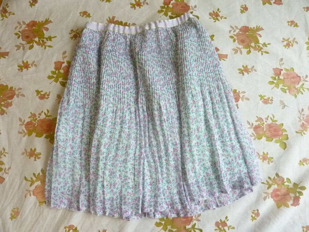 美品、組曲の涼し気な小花柄スカートです。記載サイズ150cm、お色は水色系。ポリエステルで上半分に細めのプリーツ加工されています。中に少し厚めのポリエステルの裏地がついています。平置きでスカート丈約48㎝。着用・洗濯回数は12回です。