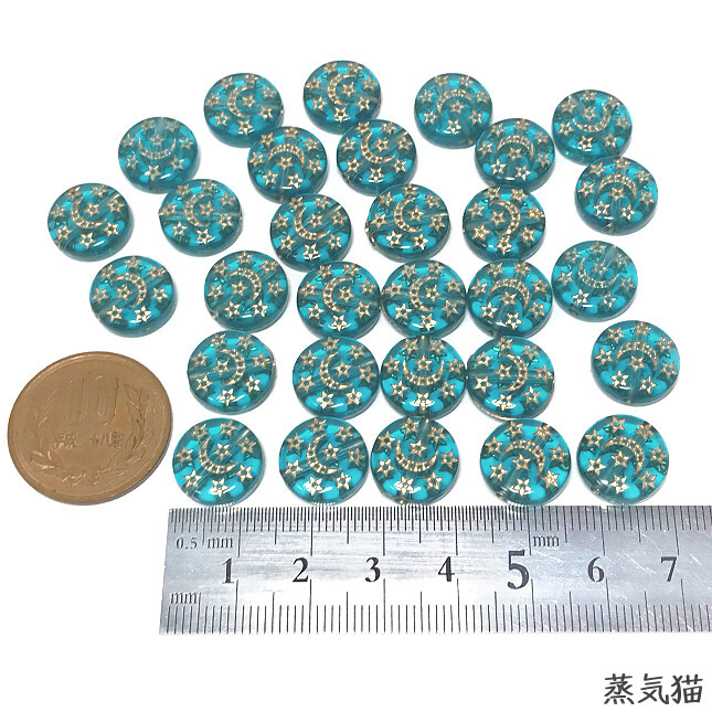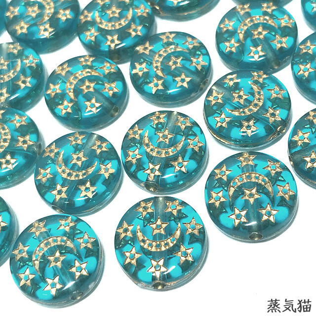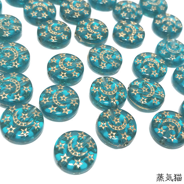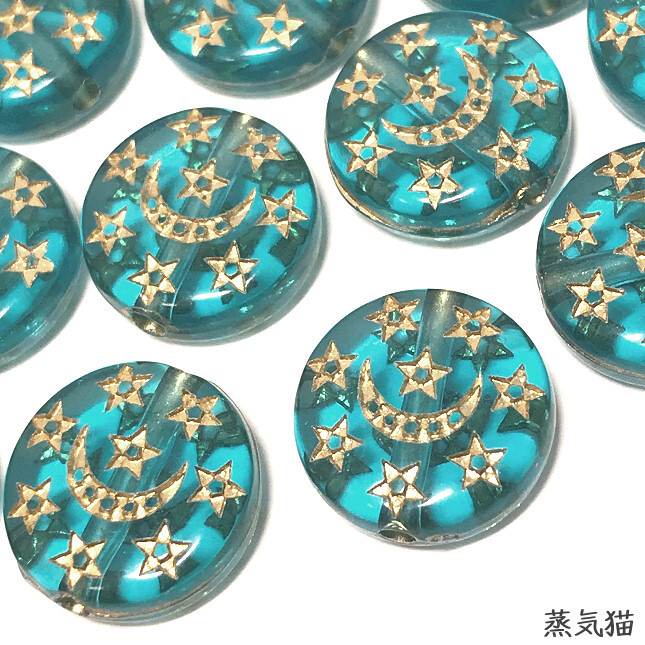 b9341 星と三日月柄ビーズ ブルーグリーン 30個【宇宙 ゴールド柄 ピアス イヤリング ハンドメイド用アクセサリーパーツ素材】蒸気猫パーツ
