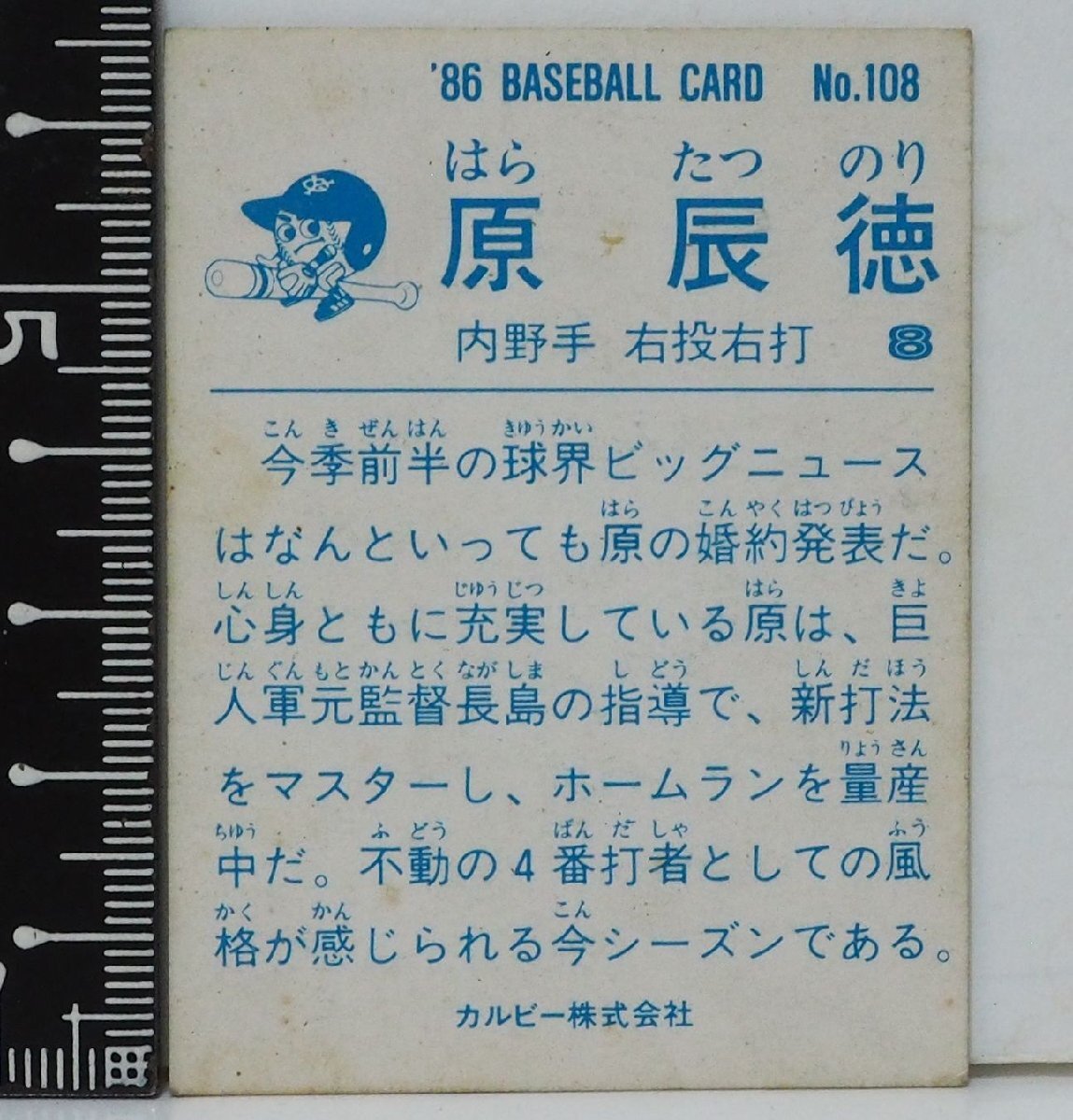 86年 カルビー プロ野球カード No.108【原 辰徳 内野手 読売ジャイアンツ巨人】昭和61年 1986年 当時物 Calbee おまけ食玩BASEBALL【中古】