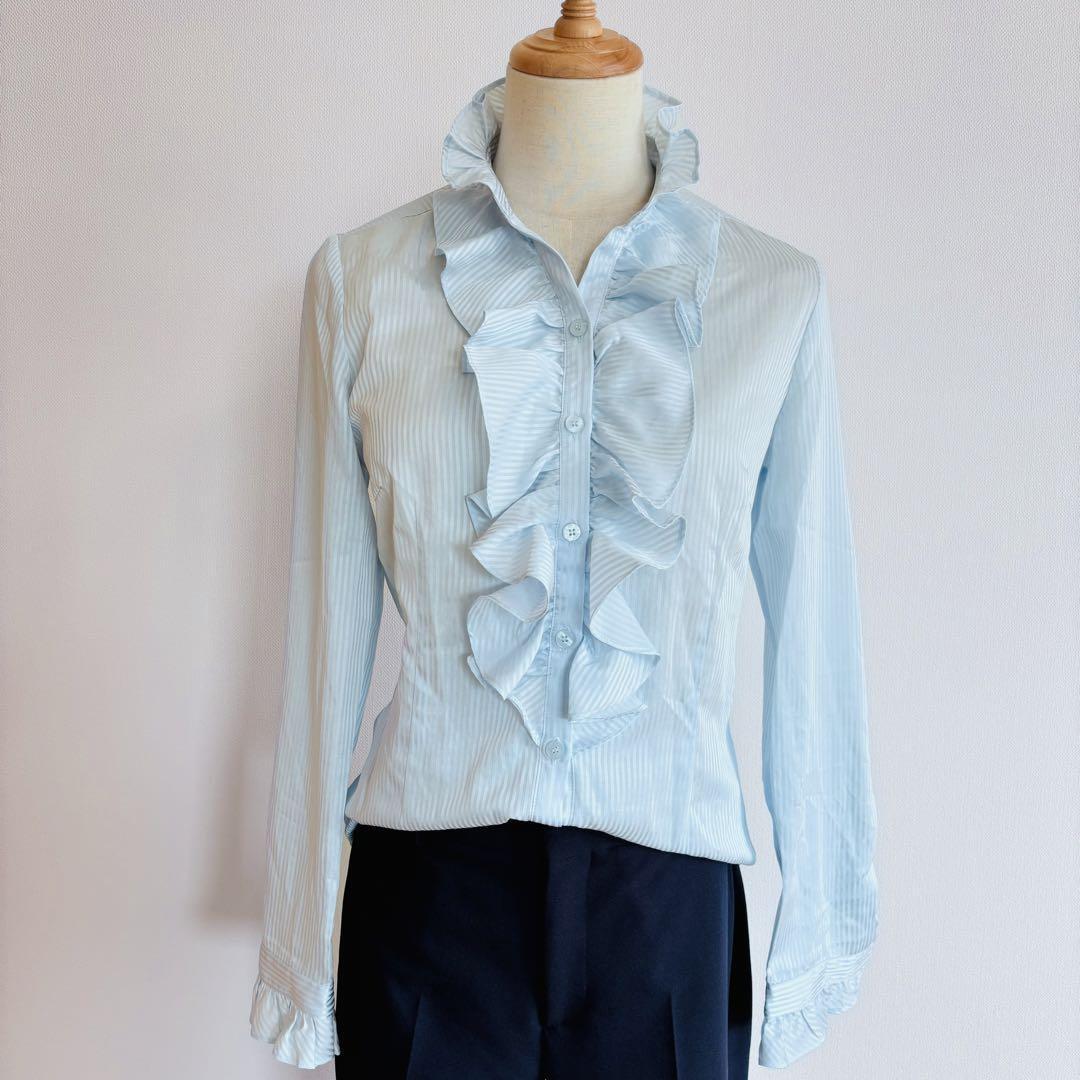 エレガントで上品な光沢感のあるフリルブラウスは、美しいフリルに目線を集め、ボリューミーなフリルが引き立つスタイリッシュなボディーラインでバランスよく仕立てました。