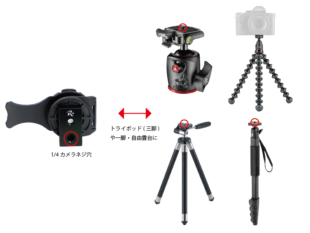 スマホでの写真撮影や、ZOOMなどのオンラインミーティングツールを活用したテレワークなどの際に、市販の三脚に装着してスマートフォンをご利用頂けます。