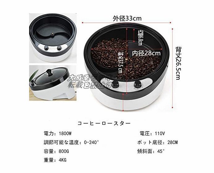 多機能大容量コーヒーロースター: 大容量800G、ハイパワー1800W。高効率、高速加熱、 攪拌均一。それはコーヒー豆、ポップコーン 豆、ひまわりの種、穀物、ナッツ、ピーナッツなどを焼くことができます。