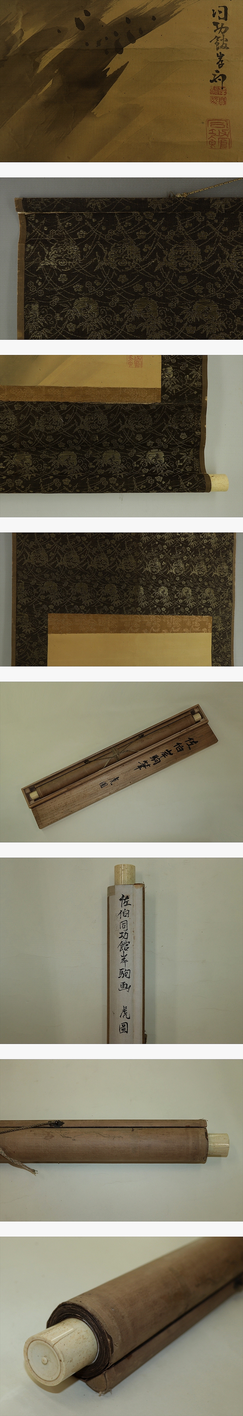 岸駒 がんく(1756-1839) 江戸時代中期-後期の画家。 宝暦6年生まれ。岸派の祖。はじめ狩野派を,のち沈南蘋や円山派などの画風をまなぶ。 鳥獣,とくに虎を得意とし,独自の画風を確立した。京都御所や金沢城の障壁画を制作。 天保9年12月5日死去。83歳。加賀(石川県)出身。 本姓は佐伯。名は駒,昌明。字は賁然。通称は雅楽助。号は華陽,蘭斎など。 本紙は、染み、汚れ、折れ、皺、浮き、ヤケがあります。 表装は、染み、汚れ、折れ、皺、虫食、破れ、ほつれ、軸先に傷みがあります。 【サイズ】 作品 横約48.5cm×縦約115cm 表装 横約65cm×縦約177cm |