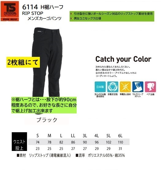 ビックイナバ特価◆TSDESIGN 6114H裾ハーフ RIP STOPメンズカーゴ【95ブラック・4Lサイズ】定価1枚8360円の品が、2枚組で即決2980円