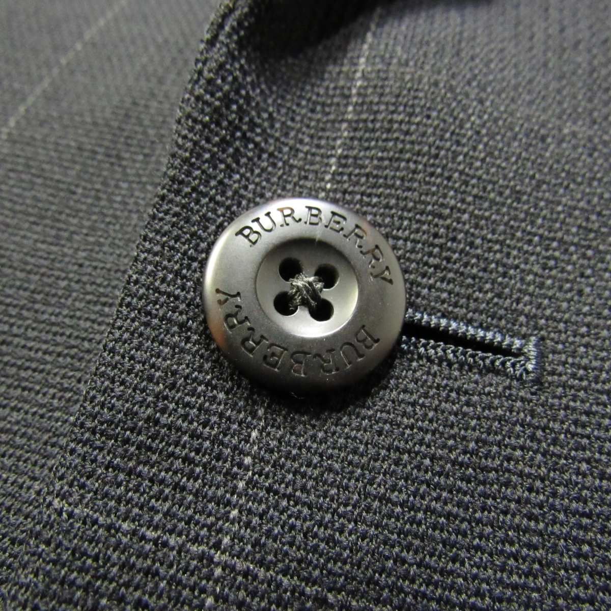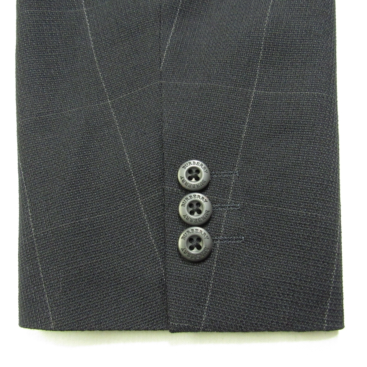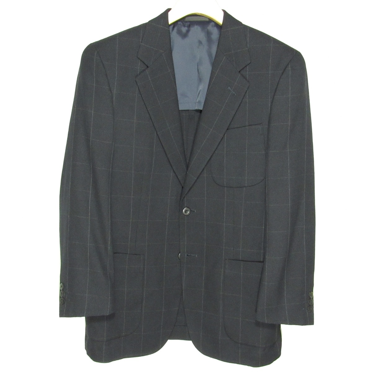 三陽商会製「BURBERRY GOLF」のスリーパッチポケットのテーラードジャケットです。 生地は薄手で通気性のよさそうな、春夏向けのウール素材です。 黒に近い濃紺の地に、細いグレーのラインの控えめなウインドウペーンです。 ボタンはブランド刻印入りです。 メンズテーラードジャケット/春夏 型番:BFE60-250-29 シングル2つボタン/ノーベント/裏地-背抜き/肩パッド有り/スリーパッチポケット/袖口3つボタン・開き見せ・額縁仕上げ |