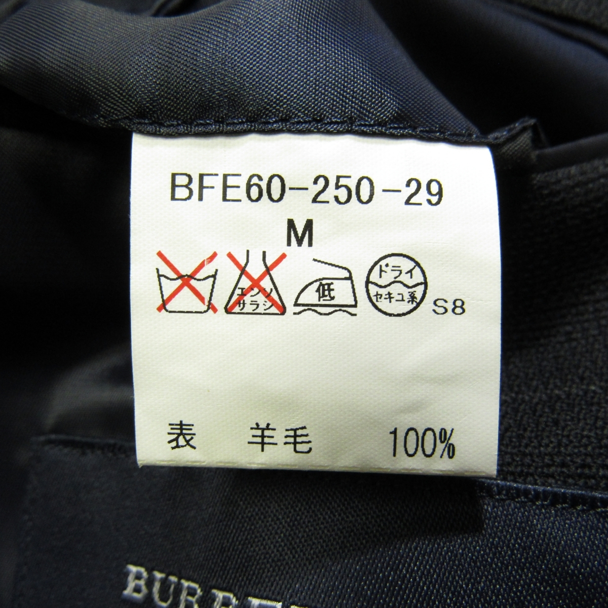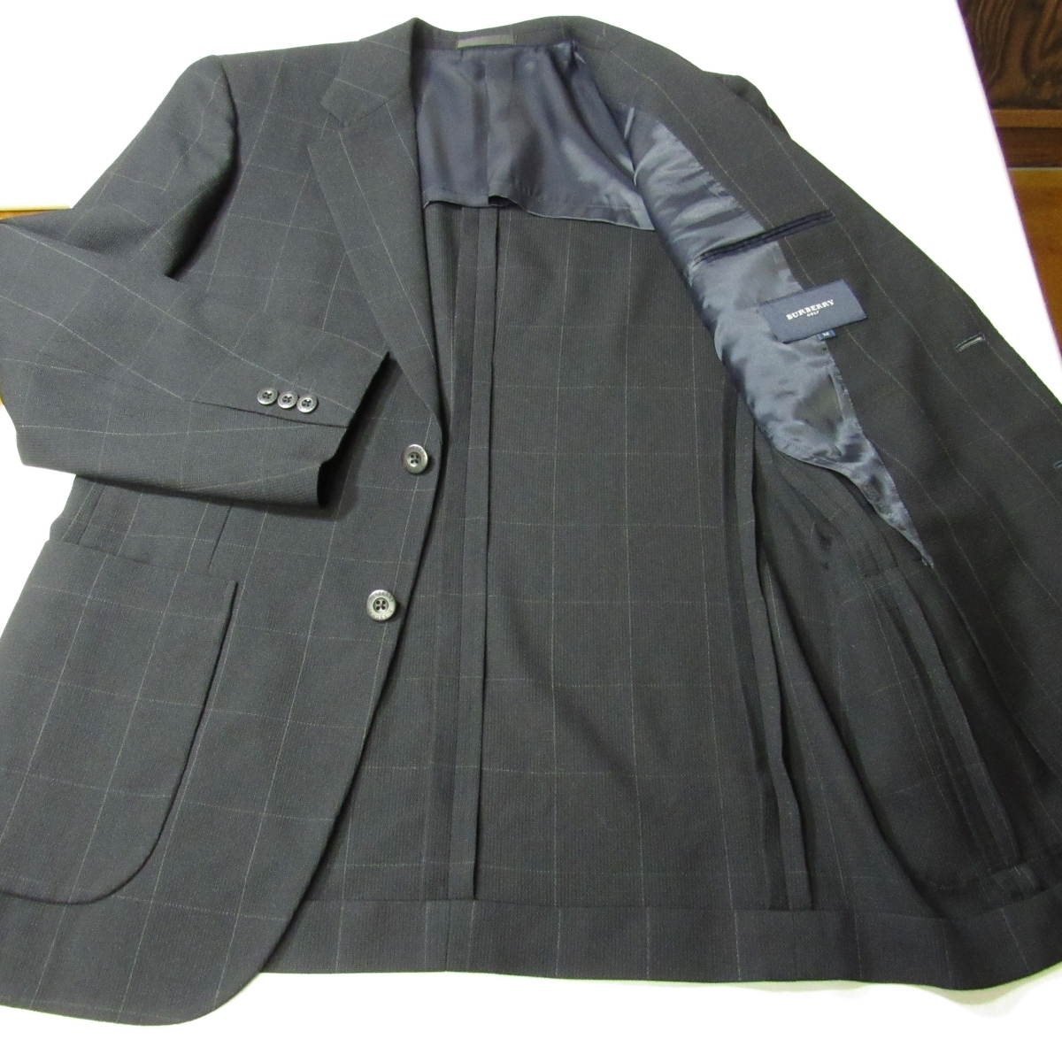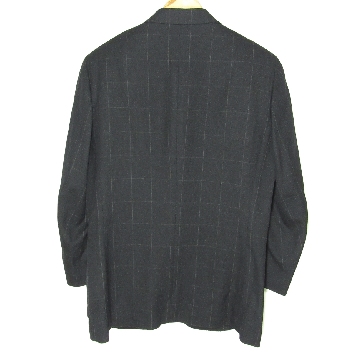 三陽商会製「BURBERRY GOLF」のスリーパッチポケットのテーラードジャケットです。 生地は薄手で通気性のよさそうな、春夏向けのウール素材です。 黒に近い濃紺の地に、細いグレーのラインの控えめなウインドウペーンです。 ボタンはブランド刻印入りです。 メンズテーラードジャケット/春夏 型番:BFE60-250-29 シングル2つボタン/ノーベント/裏地-背抜き/肩パッド有り/スリーパッチポケット/袖口3つボタン・開き見せ・額縁仕上げ |