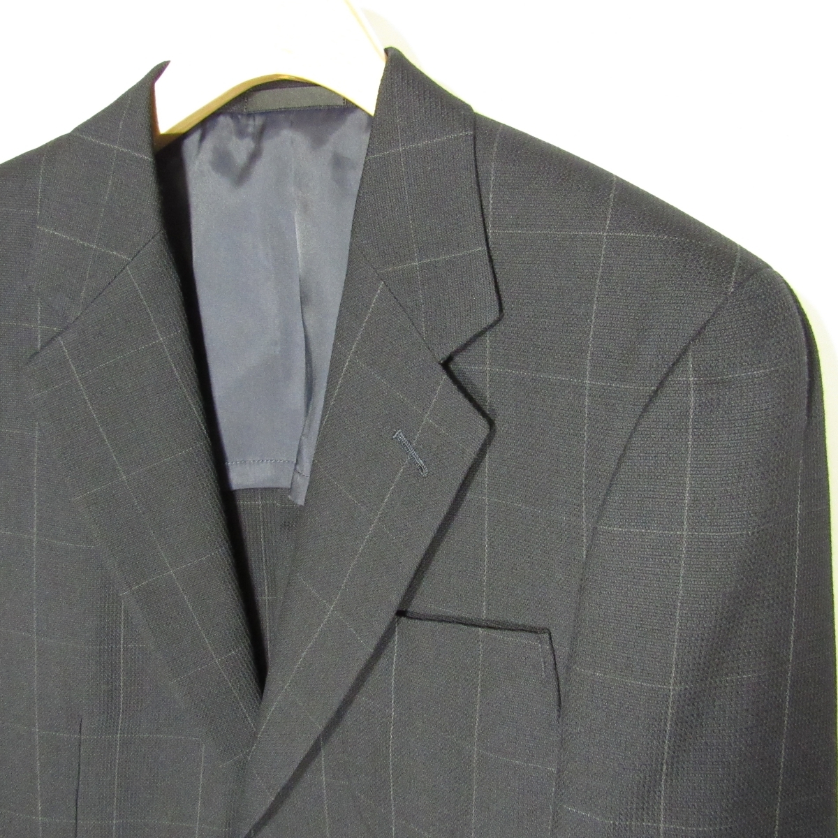 表-羊毛100% / 裏-ポリエステル・キュプラ 黒に近い濃紺の地に、細いグレーのラインのウインドウペーン |