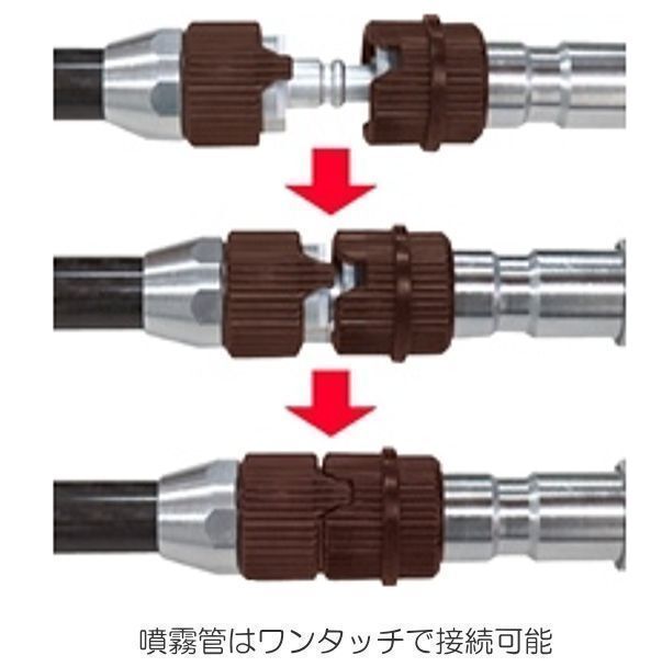 | ・フレームにアルミ製四角パイプを採用し、作業時のフレームのねじれを防止することにより、 安定した平行散布ができます。 ・カーボンパイプの採用と専用の肩掛けベルトを使用することで、作業負担を軽減します。 ・噴霧管はワンタッチで簡単に接続でき、作業時間が大幅に削減できます。 また、噴霧管先端の詰栓もワンタッチ式となり、散布作業後の水抜きが楽に行えます。(特許品) ・平行散布はムラが少なく、農薬の節約に役立ちます。 ・一度に広範囲の散布が可能なため、労力と時間が大幅に削減できます。 | |