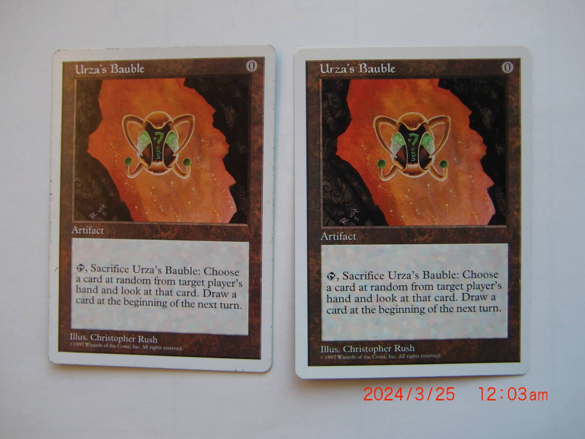 B知人の委託品です。 画像が全てです。 MTG ウルザのガラクタ/Urza's Bauble 英語4枚 です。 何語だか分らない時があります。 エキスパンション、外国語(言葉)は画像で確認をお願いします。 カードはプレイしています。 程度はカードに目立つ擦り傷、キズ、ペン跡のようなキズ、汚れ、角や端に傷、黒枠にキズ、などのキズが結構あります。 カードからタバコや香水の匂いがします。 気が付かない部分がありますので程度を気にする方は入札をご遠慮下さい。 程度はボロ、ジャンクです。 コレクションには向きません。 何か起きた場合には自分では対応が出来ませんのでご理解頂ける方のみ入札をお願いします。 普通郵便で発送します。 郵便事故や郵便破損が起きた場合には保障できません。 ノ-クレーム、ノーリターンでお願いします。